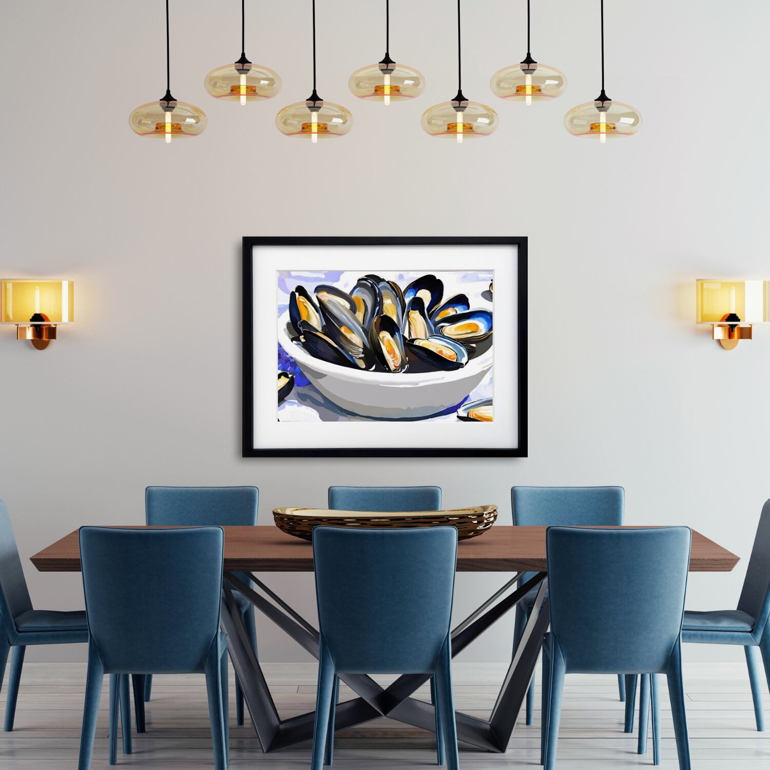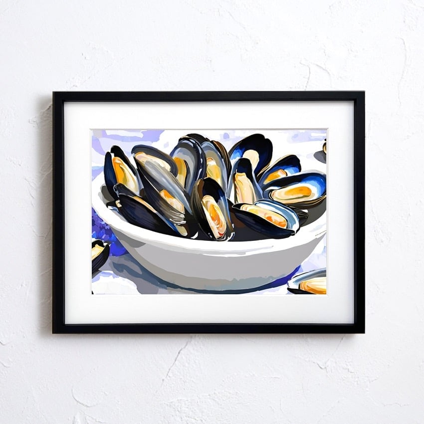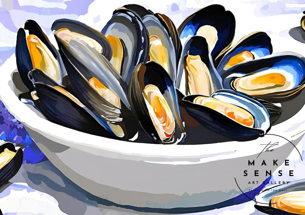 地中海の風を感じさせる一皿を切り取ったような『Mussels on the Table』。瑞々しいブルーとオレンジのコントラストが美しく、見る人を海辺のレストランへと誘います。シェルの光沢感と大胆な筆致で描かれたムール貝は、食文化の豊かさとエネルギッシュな生命力を感じさせ、キッチンやダイニングルームに華やぎを添えます。