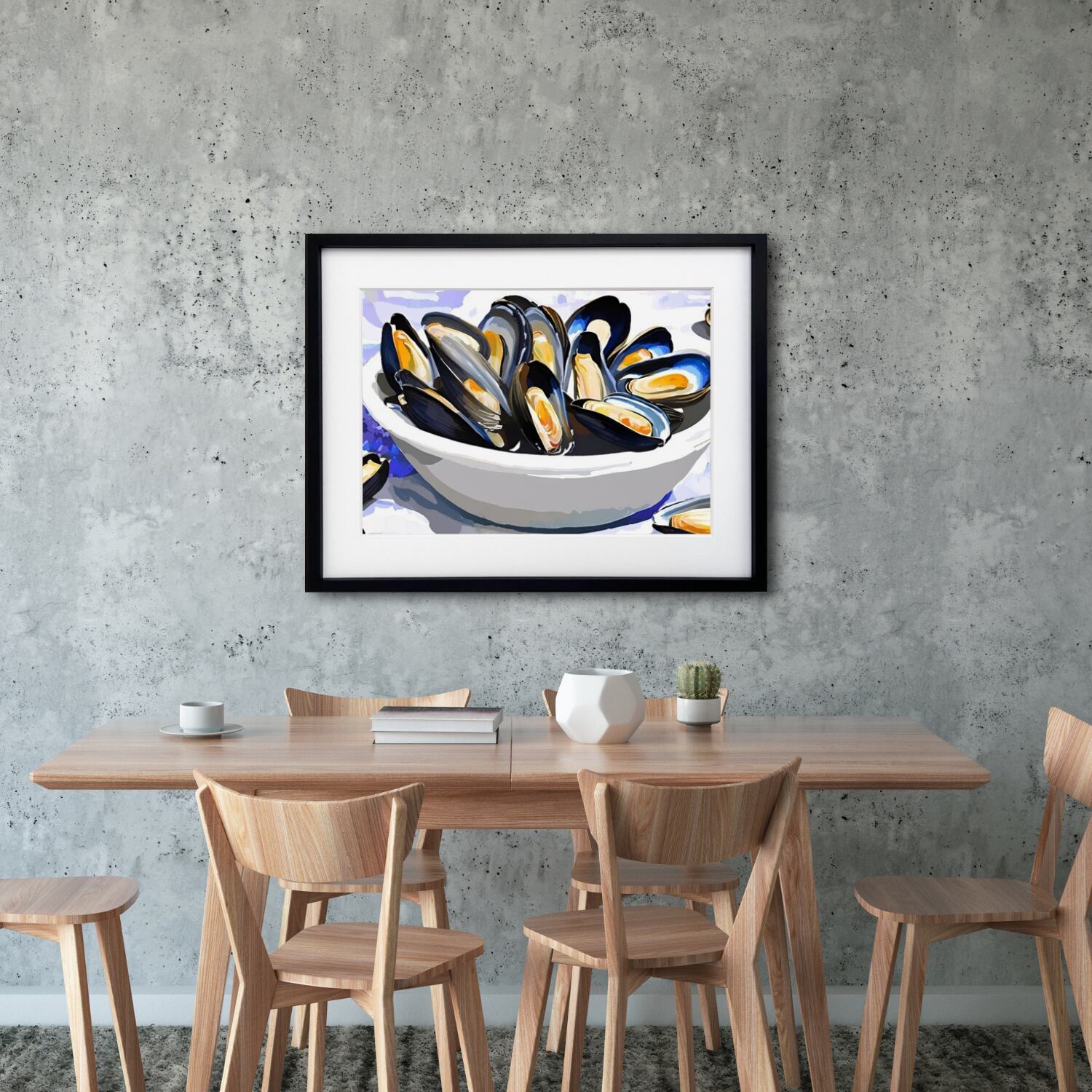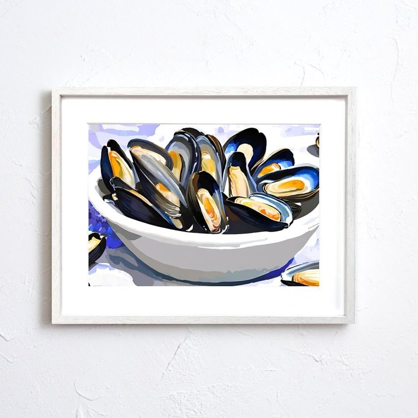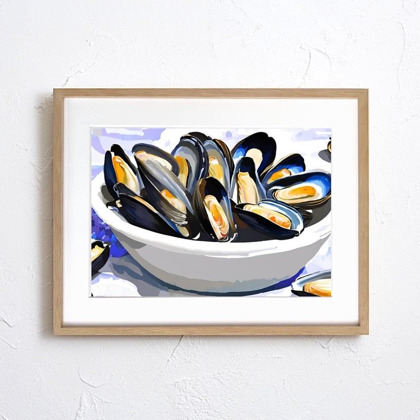 地中海の風を感じさせる一皿を切り取ったような『Mussels on the Table』。瑞々しいブルーとオレンジのコントラストが美しく、見る人を海辺のレストランへと誘います。シェルの光沢感と大胆な筆致で描かれたムール貝は、食文化の豊かさとエネルギッシュな生命力を感じさせ、キッチンやダイニングルームに華やぎを添えます。