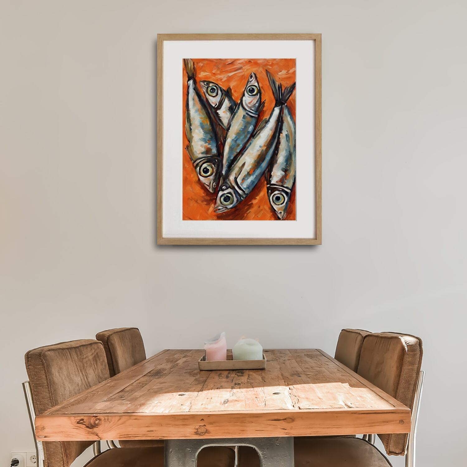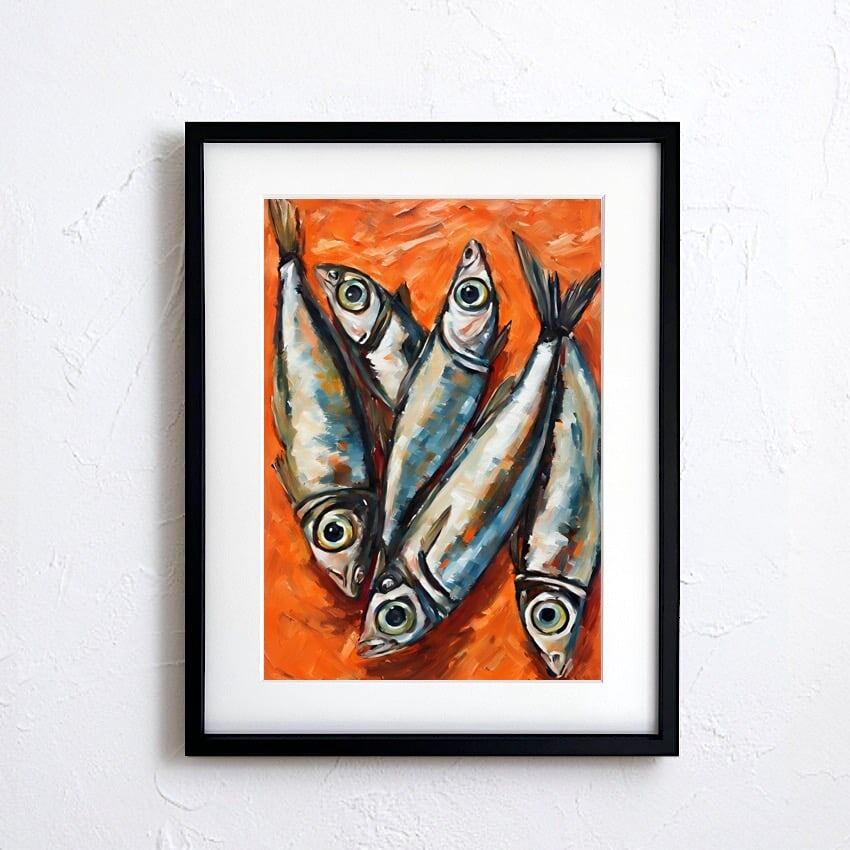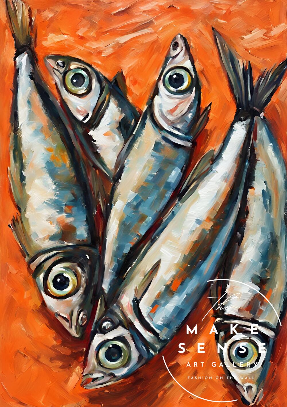 鮮烈なオレンジの背景の上に、銀色に輝く5匹の魚が大胆に描かれた【エネルギッシュでユニークなポップアート】。