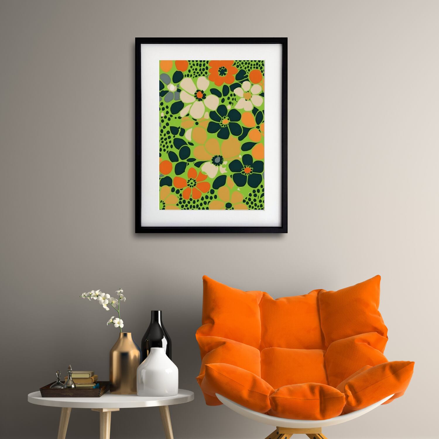 鮮やかなグリーンを背景に、オレンジ・クリーム・ディープグリーンの花々が咲き誇る、【生命力あふれるポップアート】。