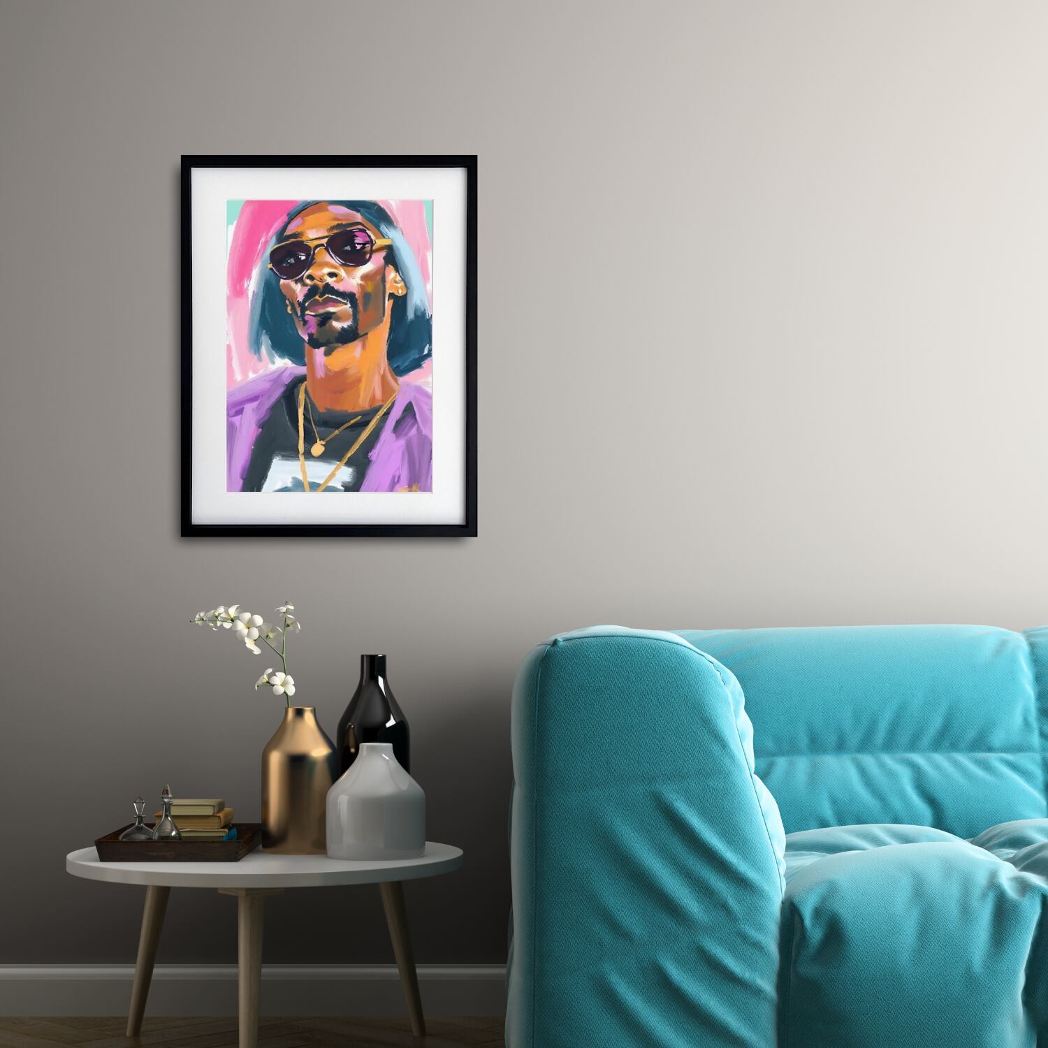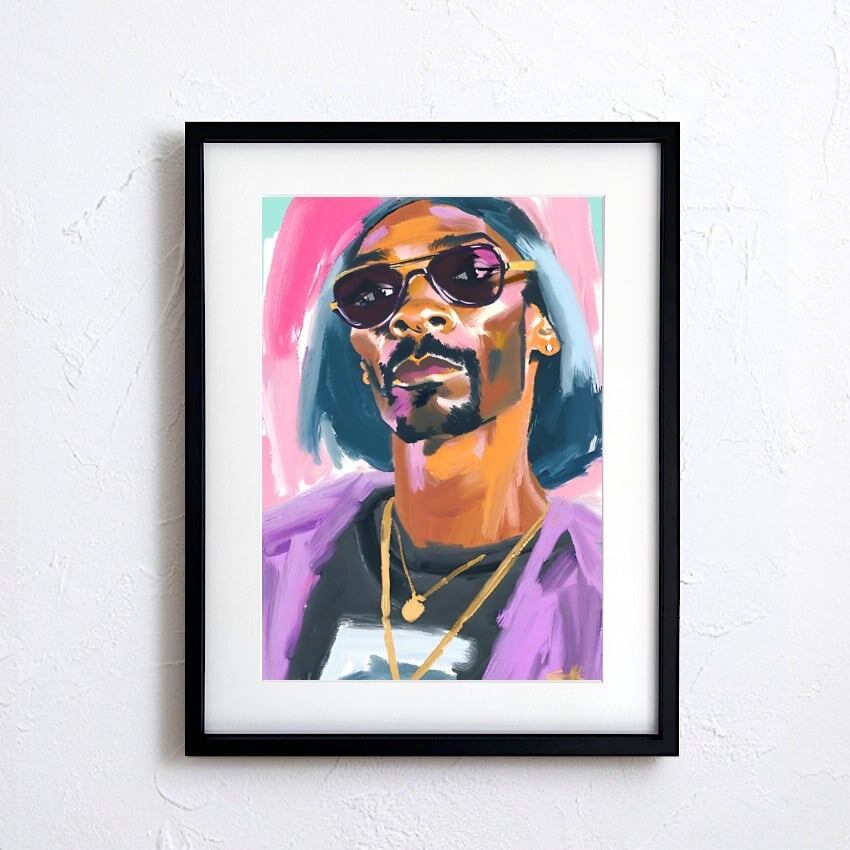 世界的ヒップホップアイコン Snoop Dogg を、ポップで鮮やかな色彩で描き出したポートレートアート。