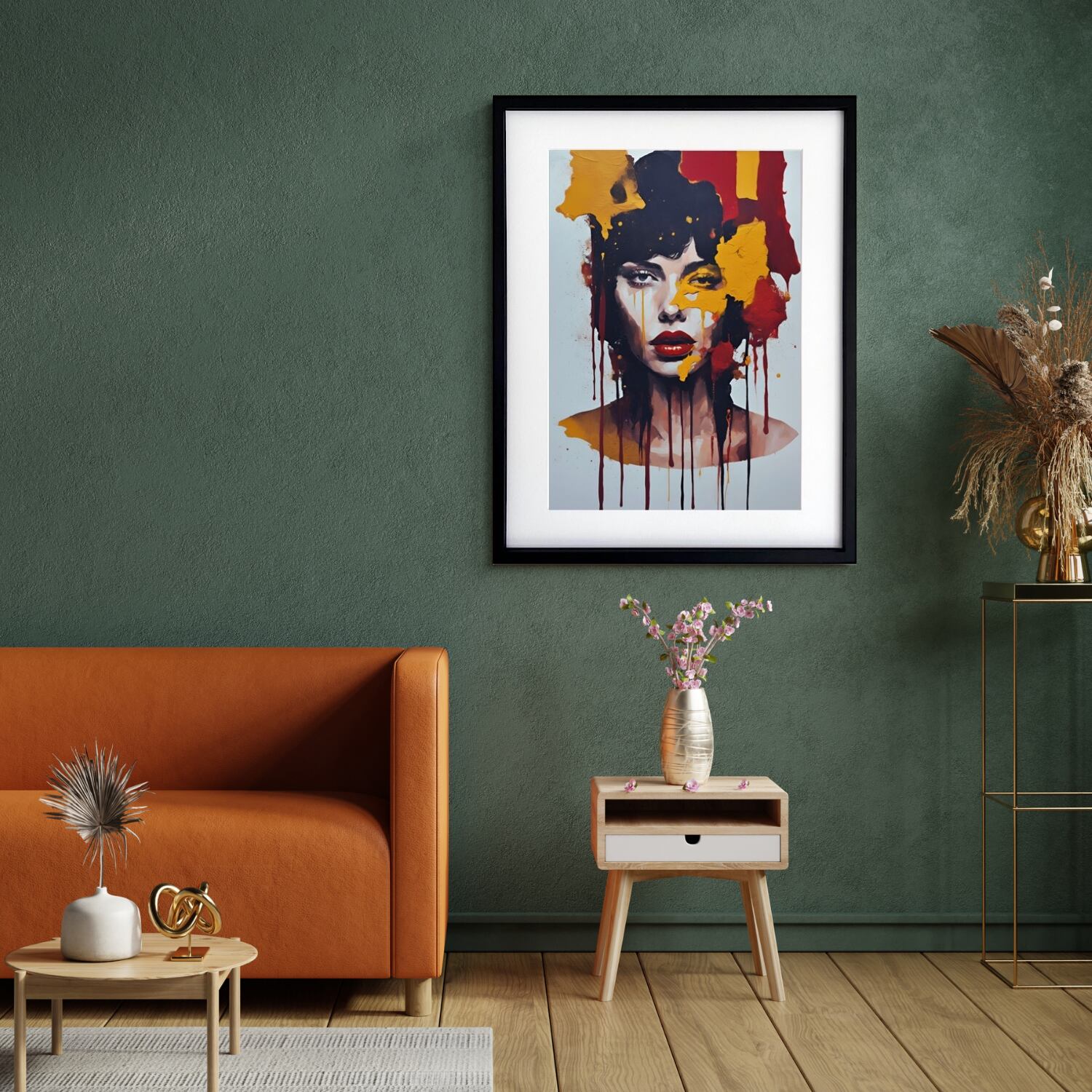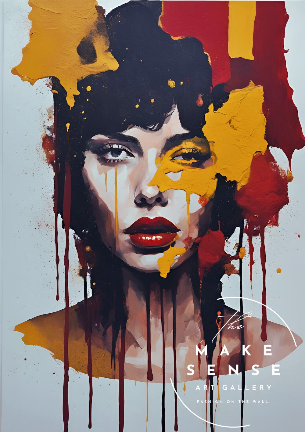 艶やかな赤い唇、力強い眼差し、そして滴り落ちる絵の具は、まるで感情の爆発を具現化したかのよう。