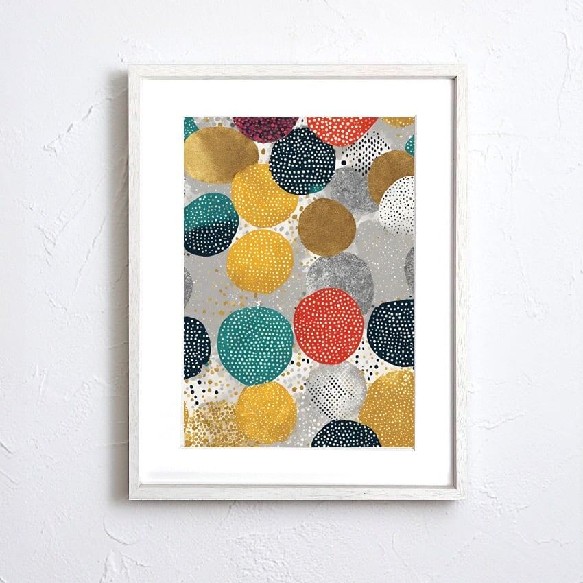 Metallic Dots Symphony|煌めくメタリックと色彩が奏でるモダンアートポスター|北欧やホテルライク空間を上質に彩るインテリアA4ポスター