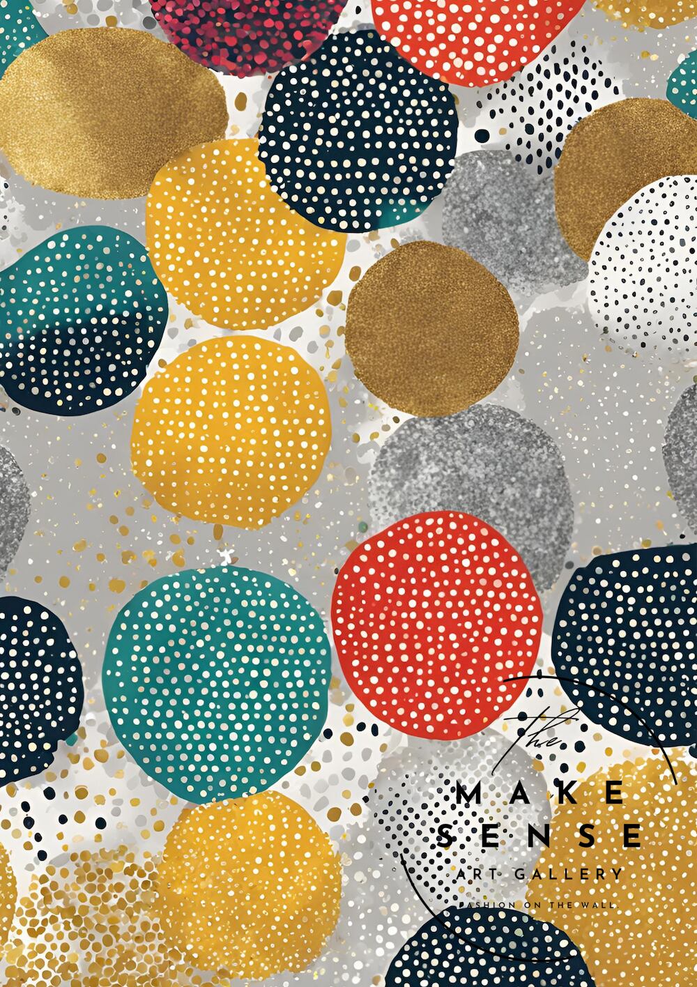 ゴールド・シルバー・ネイビー・マスタードイエロー・ティール・レッドの円形が、大小の白や黒のドットで装飾され、立体感とリズムを生み出します。