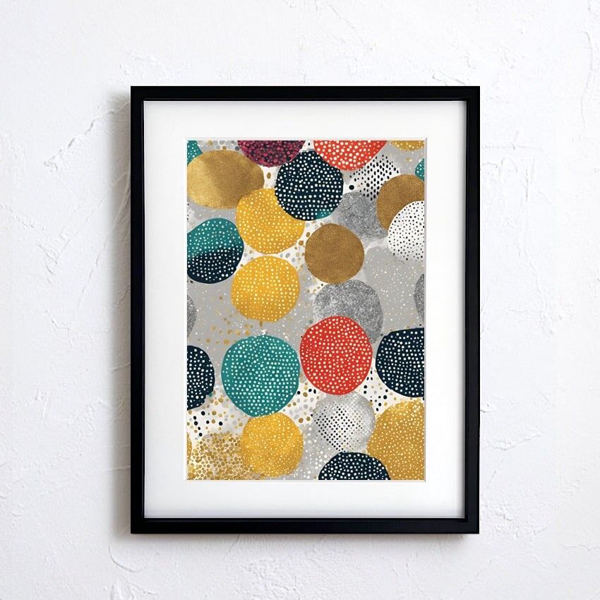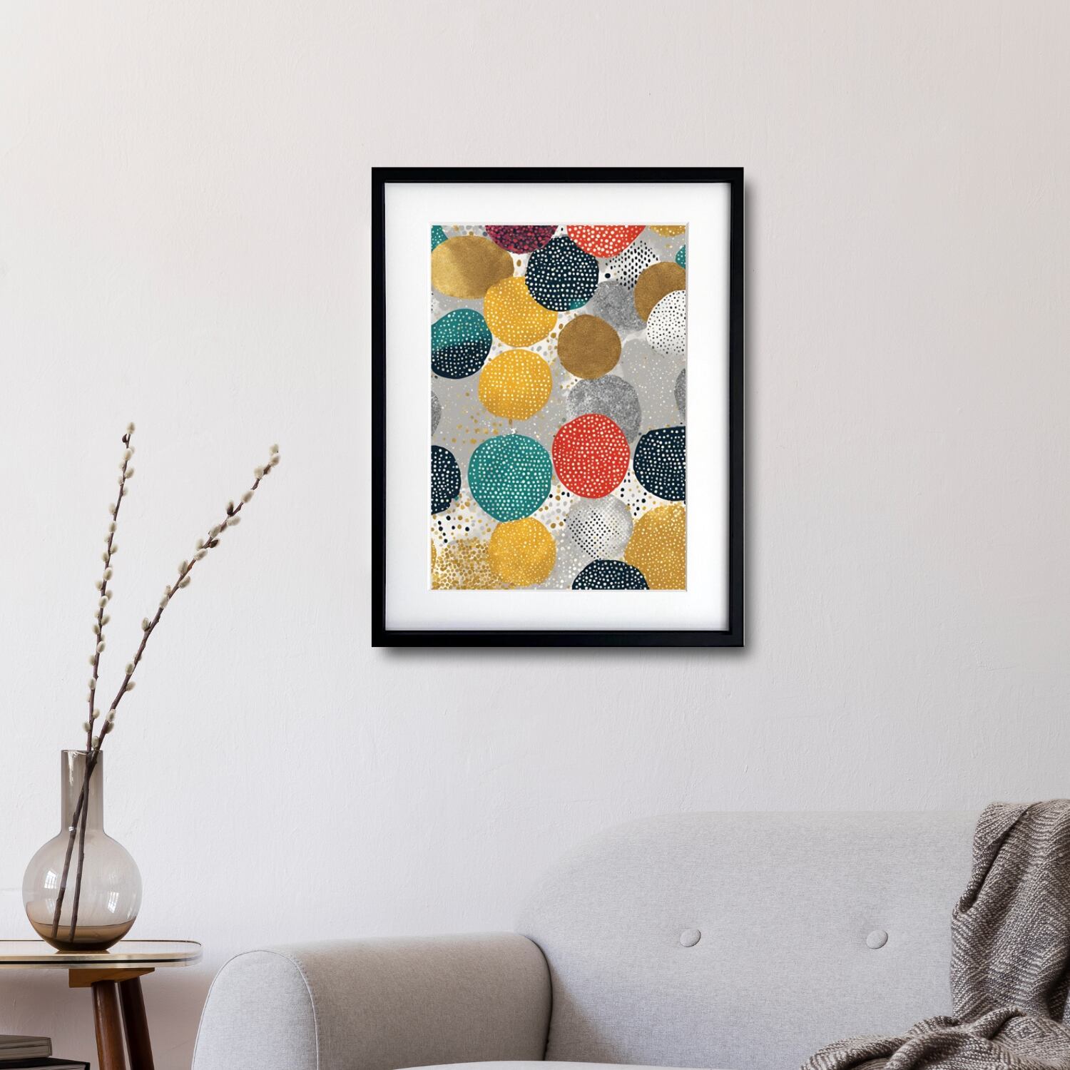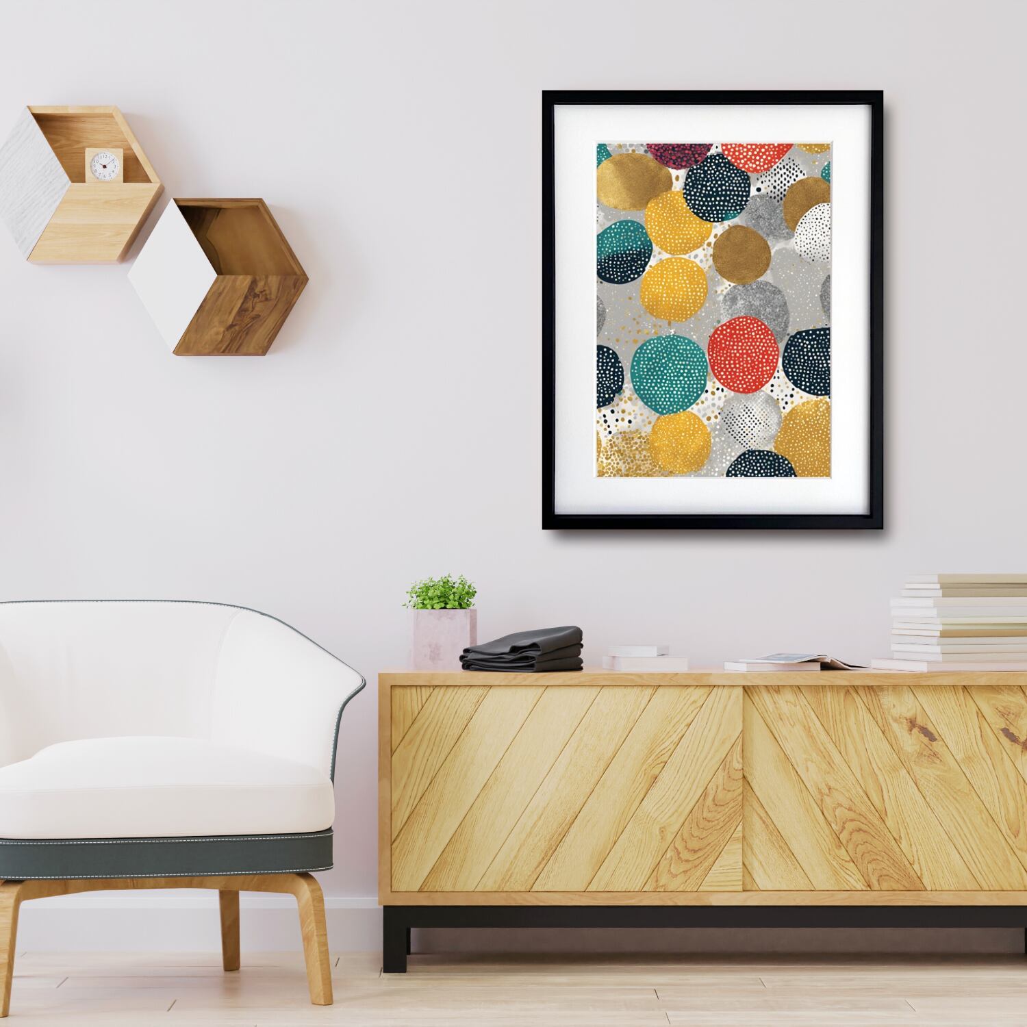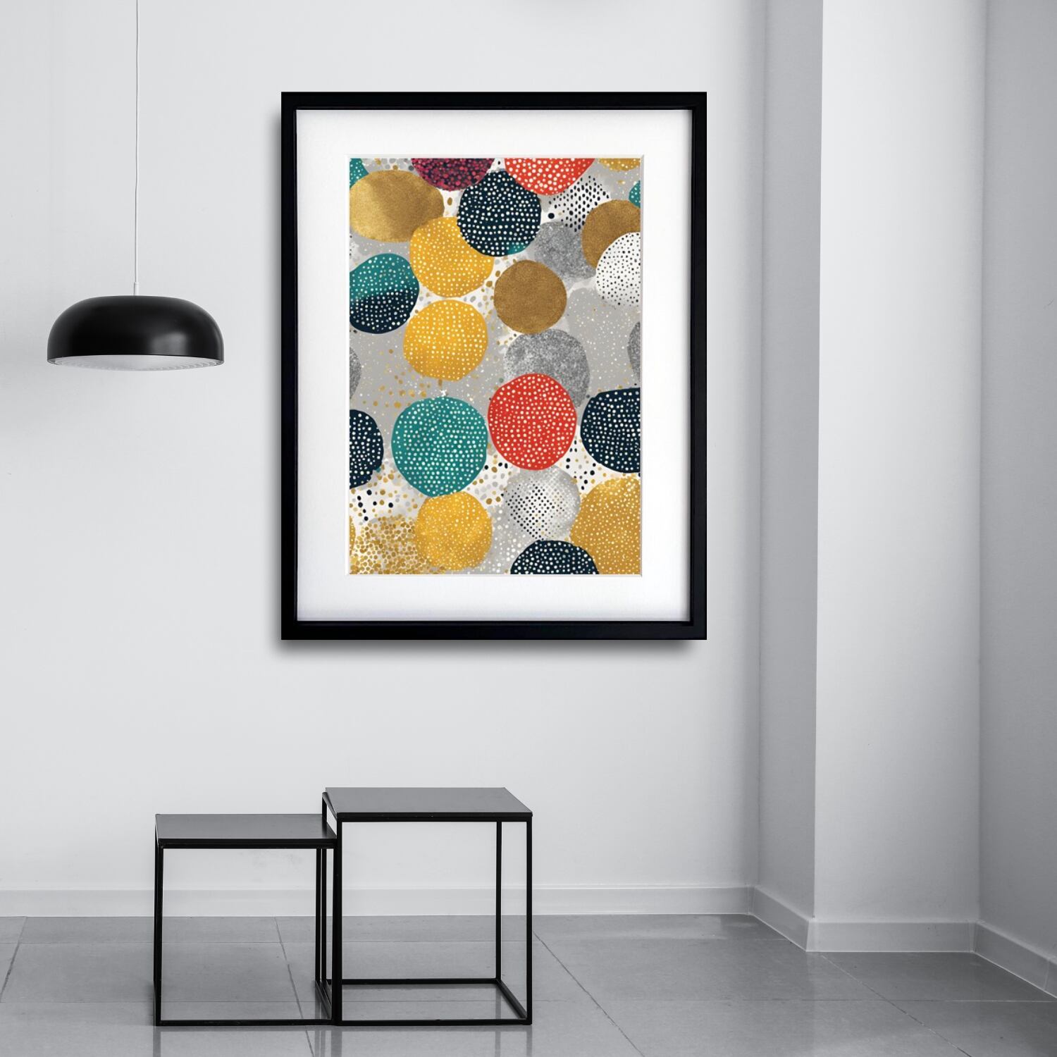 Metallic Dots Symphony|煌めくメタリックと色彩が奏でるモダンアートポスター|北欧やホテルライク空間を上質に彩るインテリアA2ポスター