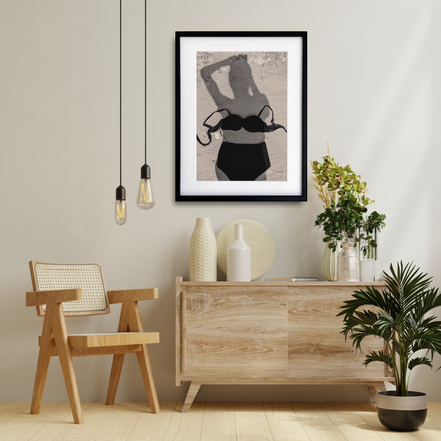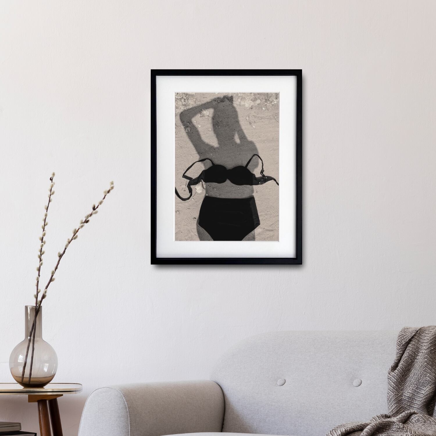 砂上のシルエット|モノクロが映す影とビキニのミニマルフォトアートポスター|大人のビーチインテリアに|A4ポスター