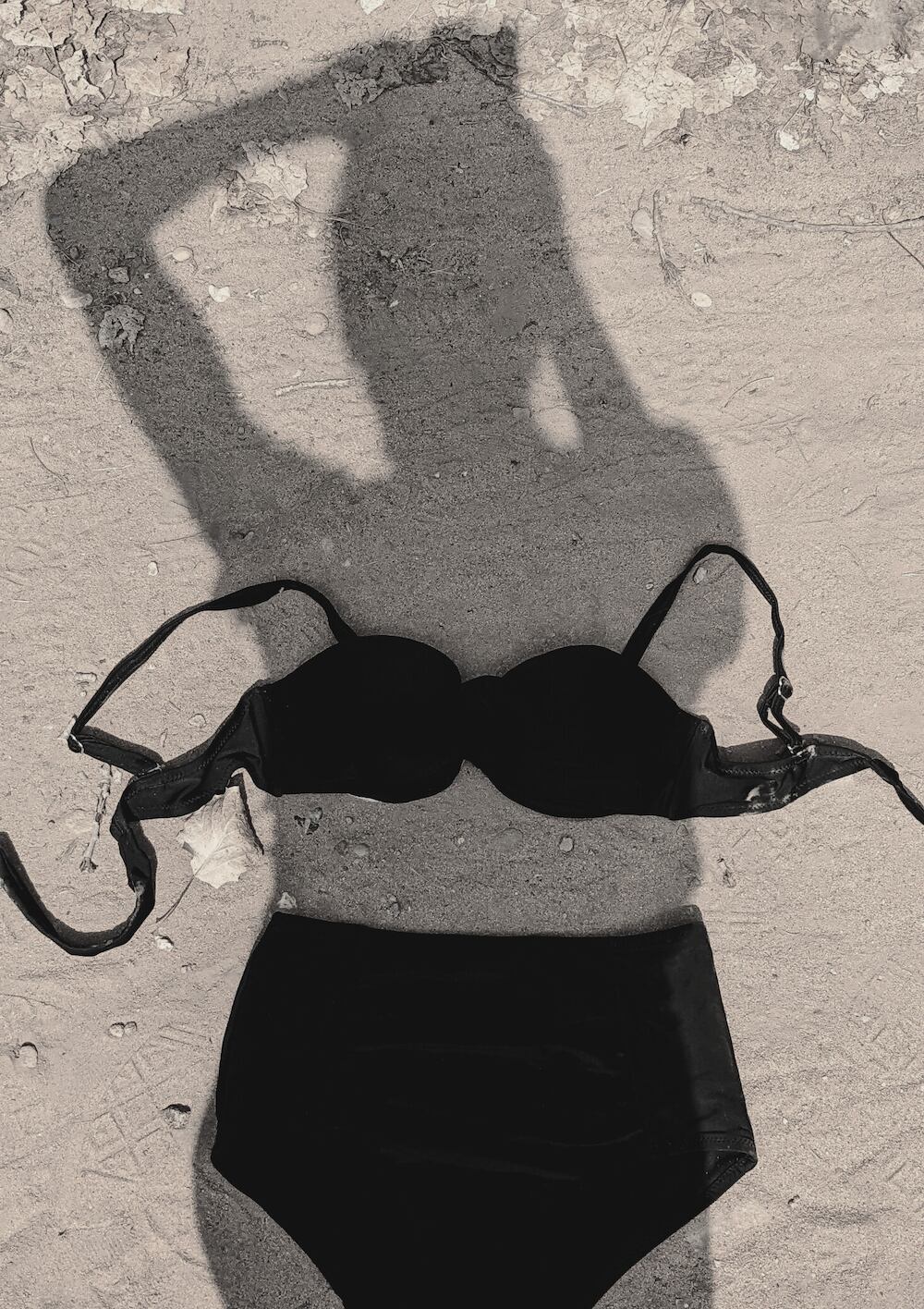 砂浜に置かれたビキニと、人物の影だけを切り取ったモノクロフォトアート。