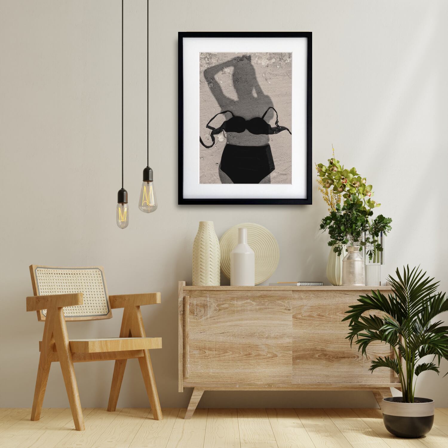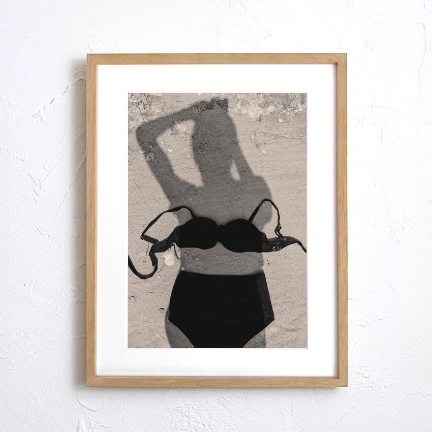 砂上のシルエット|モノクロが映す影とビキニのミニマルフォトアートポスター|大人のビーチインテリアに|A3ポスター