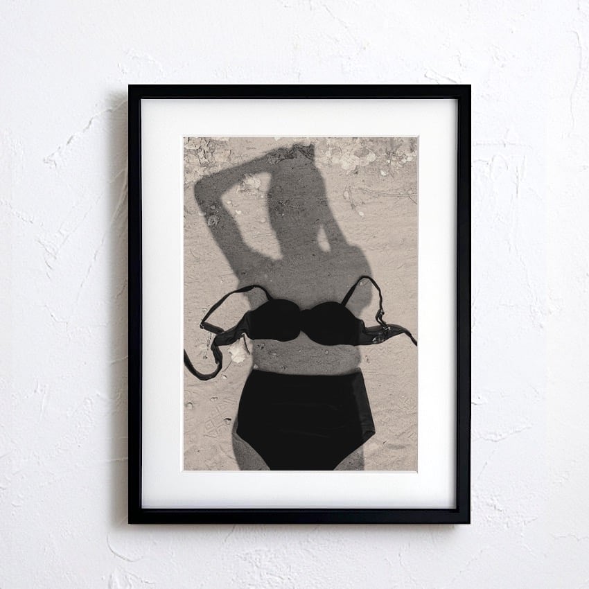 砂浜に置かれたビキニと、人物の影だけを切り取ったモノクロフォトアート。