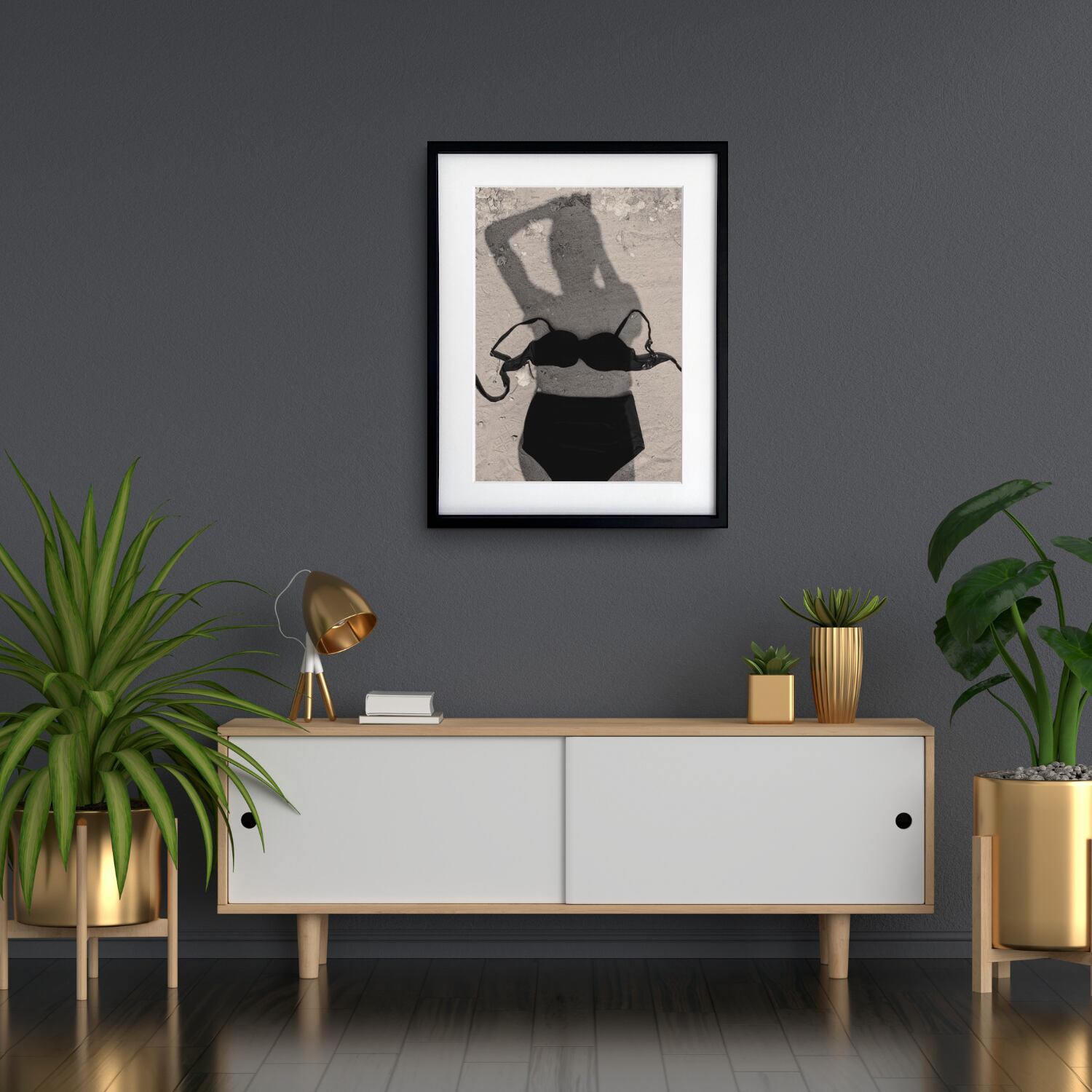 砂上のシルエット|モノクロが映す影とビキニのミニマルフォトアートポスター|大人のビーチインテリアに|A2ポスター