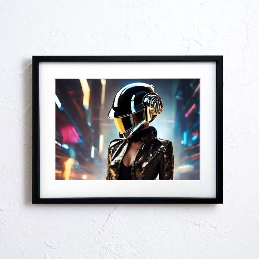 ゴールドメタリックのヘルメットとレザージャケットが輝く、近未来サイバーパンクアート。