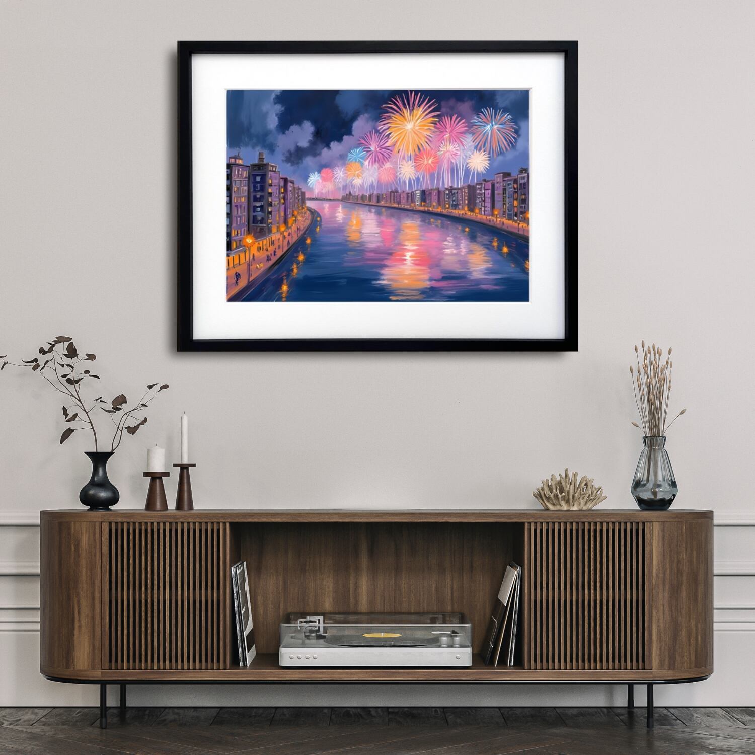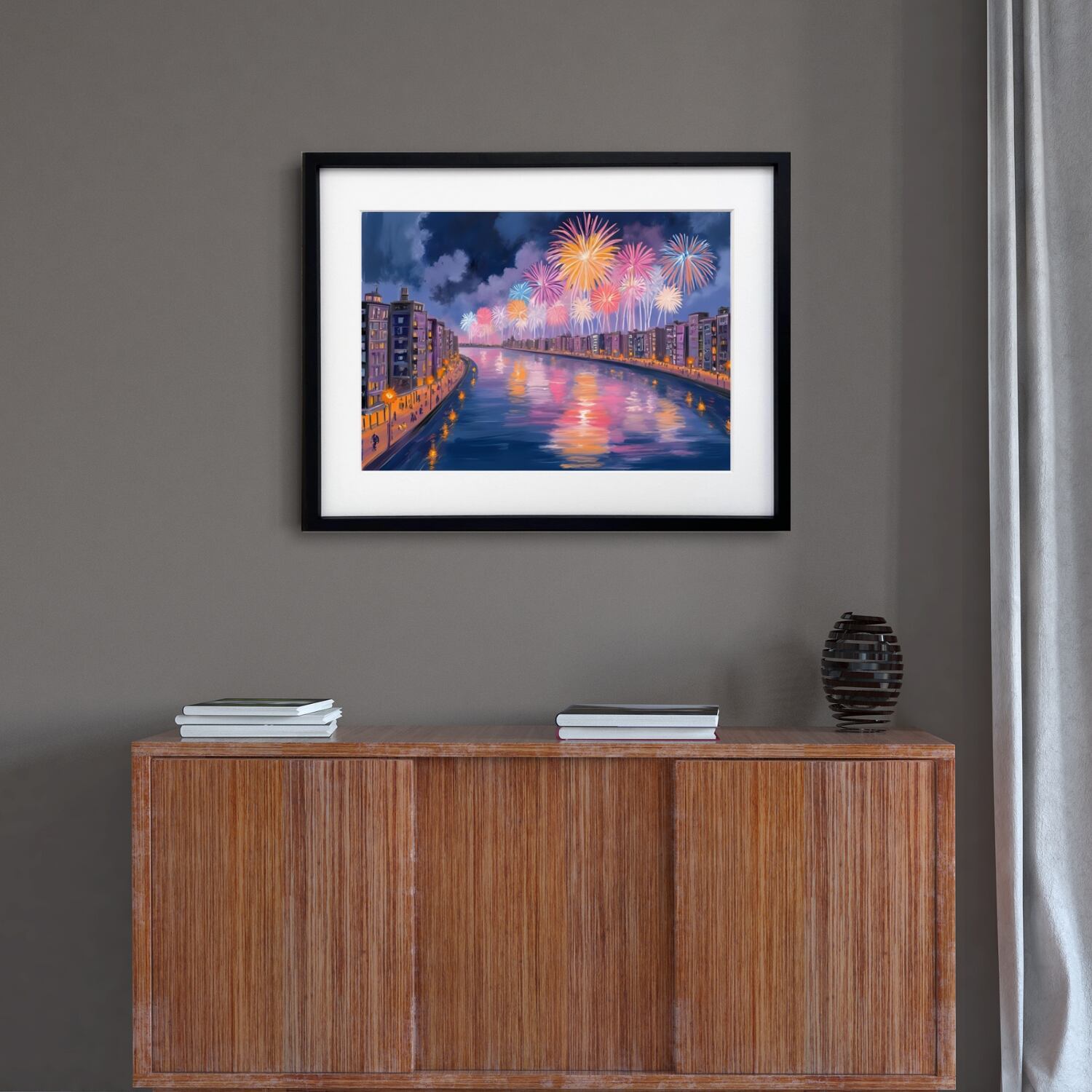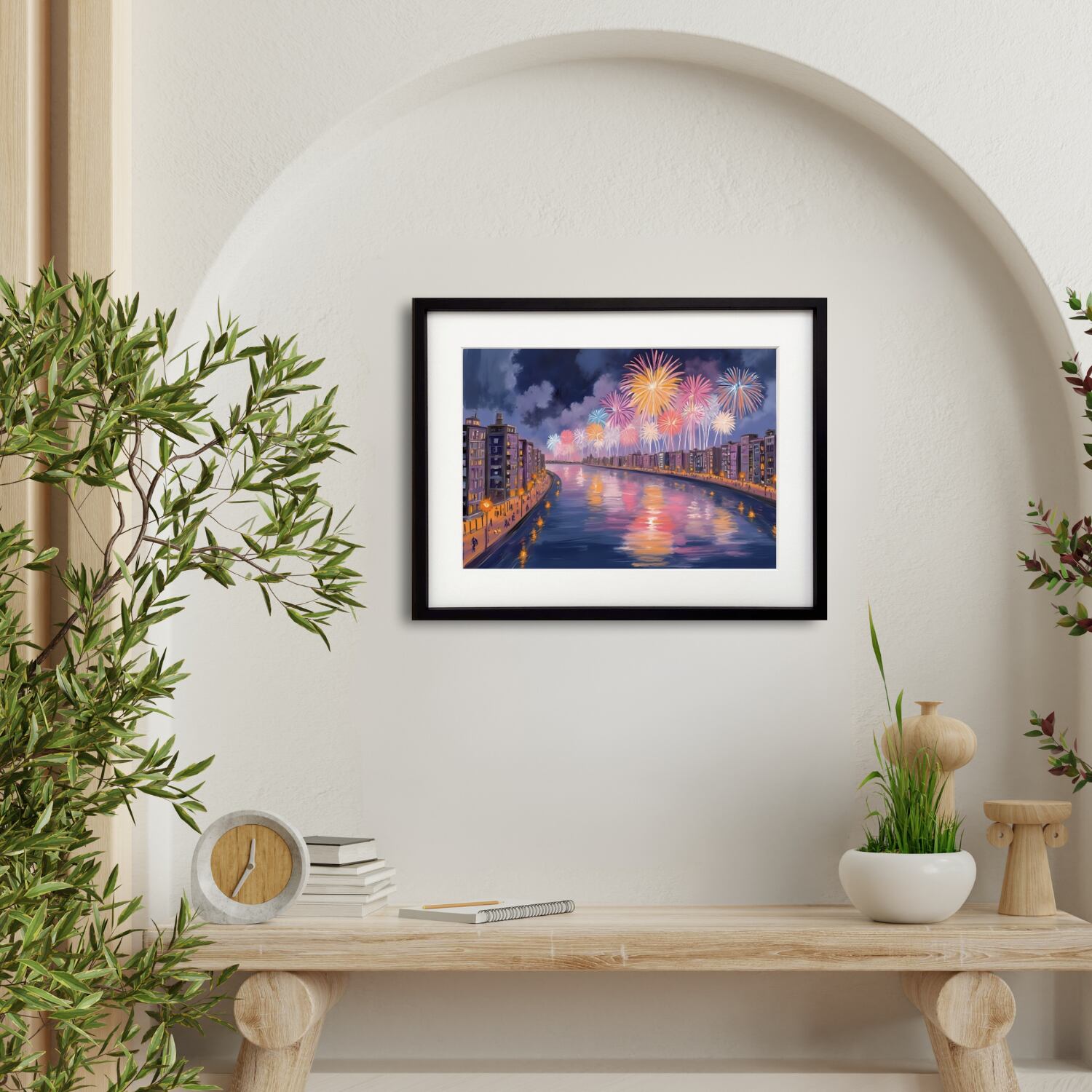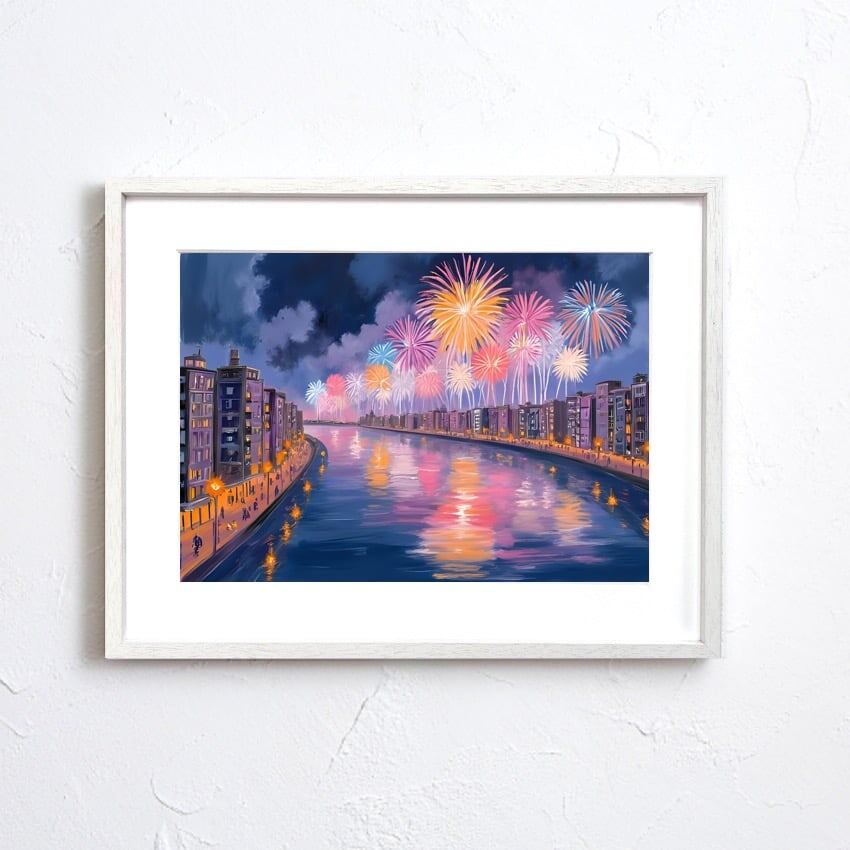 夏の思い出|花火と夜景が広がる幻想的アートポスター|和モダン空間に映える季節の人気作品|A4ポスター