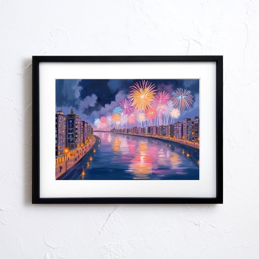 夜空に咲く花火と水面に揺れる光の反射を繊細に描いた、幻想的なデジタルアートポスター。