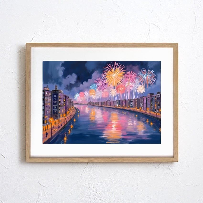 夏の思い出|花火と夜景が広がる幻想的アートポスター|和モダン空間に映える季節の人気作品|A3ポスター
