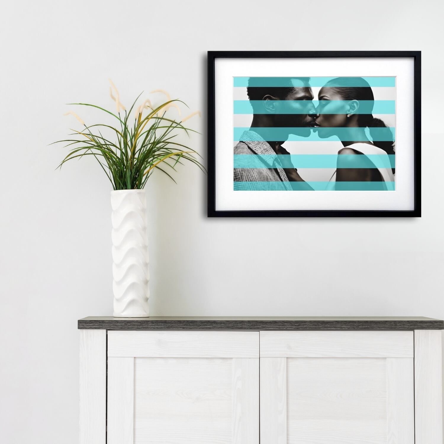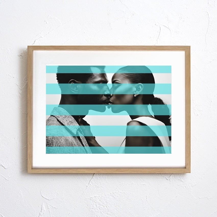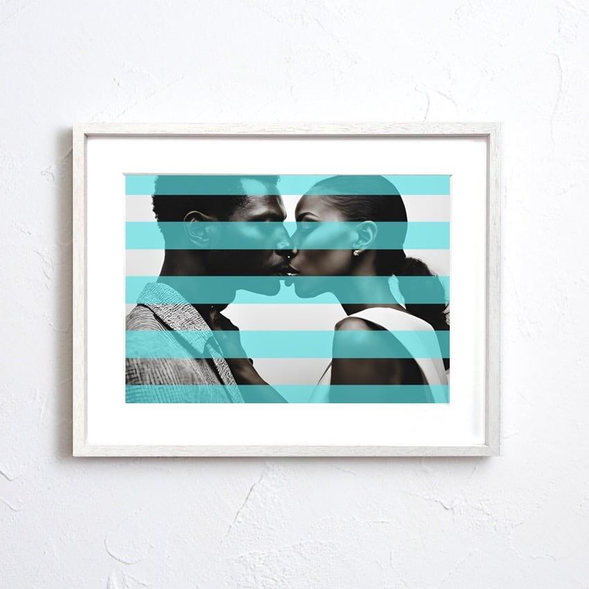 ティール・キス|モノクロキスシーン×ティールブルーが映えるモダンアートポスター|スタイリッシュ空間に最適|A2ポスター