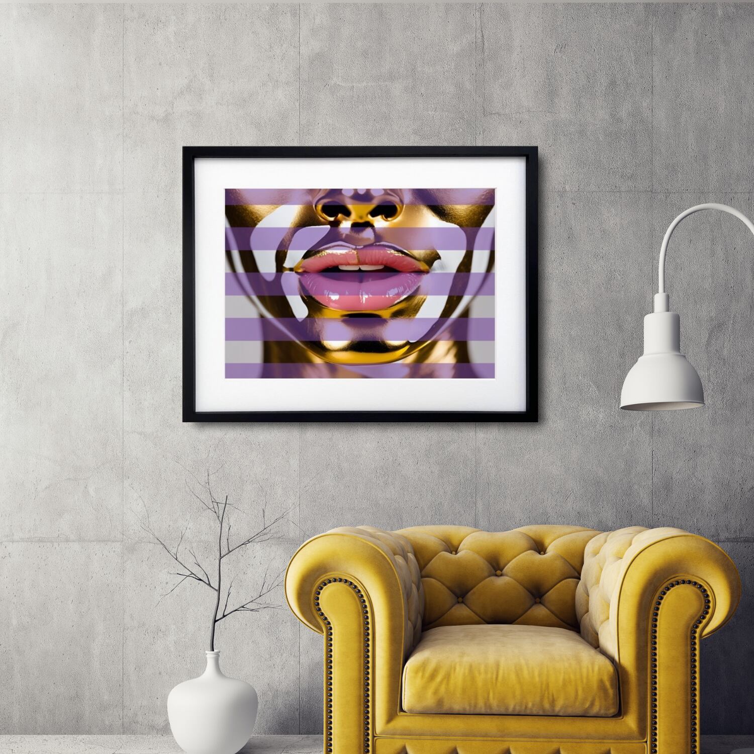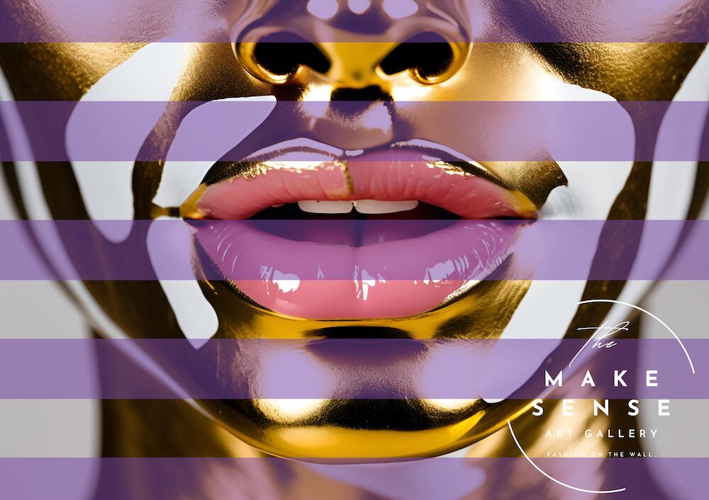 ミラージュ・ゴールド|輝くメタリックフェイス×パープルストライプの大胆アートポスター|モダン空間の主役に|A2ポスター