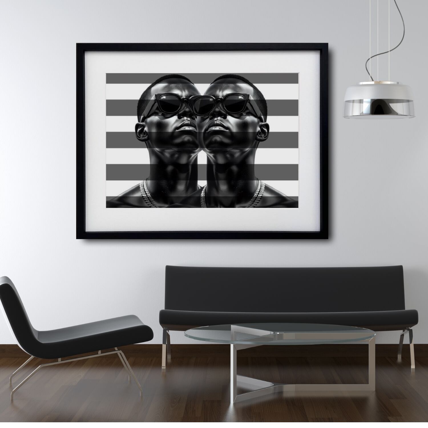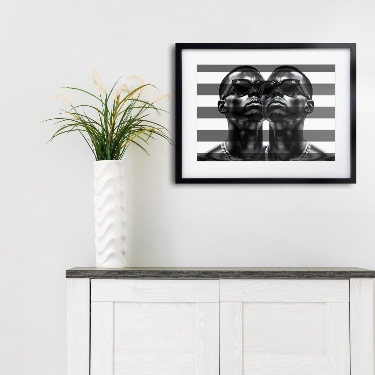 モノクロの強さとストライプのシャープさが融合した、存在感あるポートレートアート。