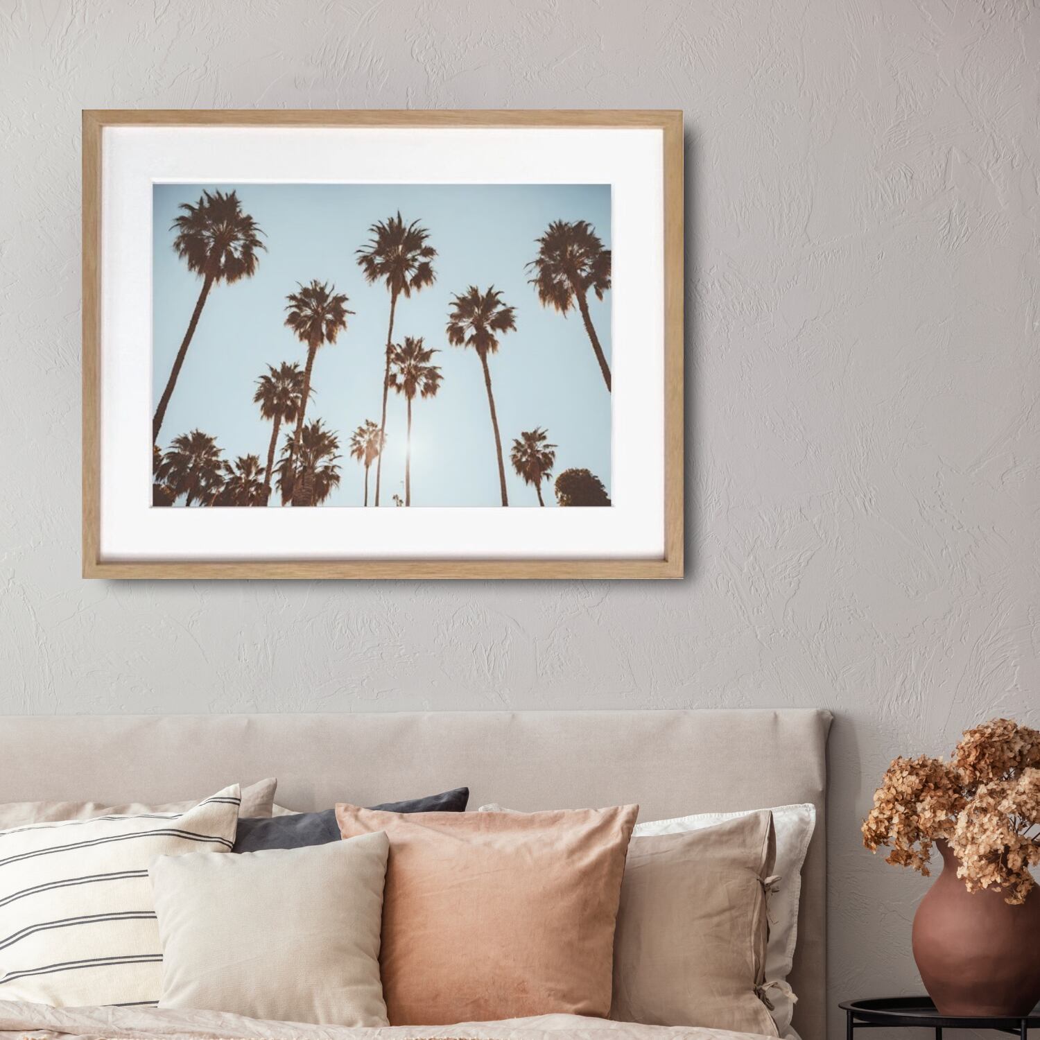 太陽を浴びて伸びるパームツリーを、ヴィンテージ感のある色合いで描いた一枚。