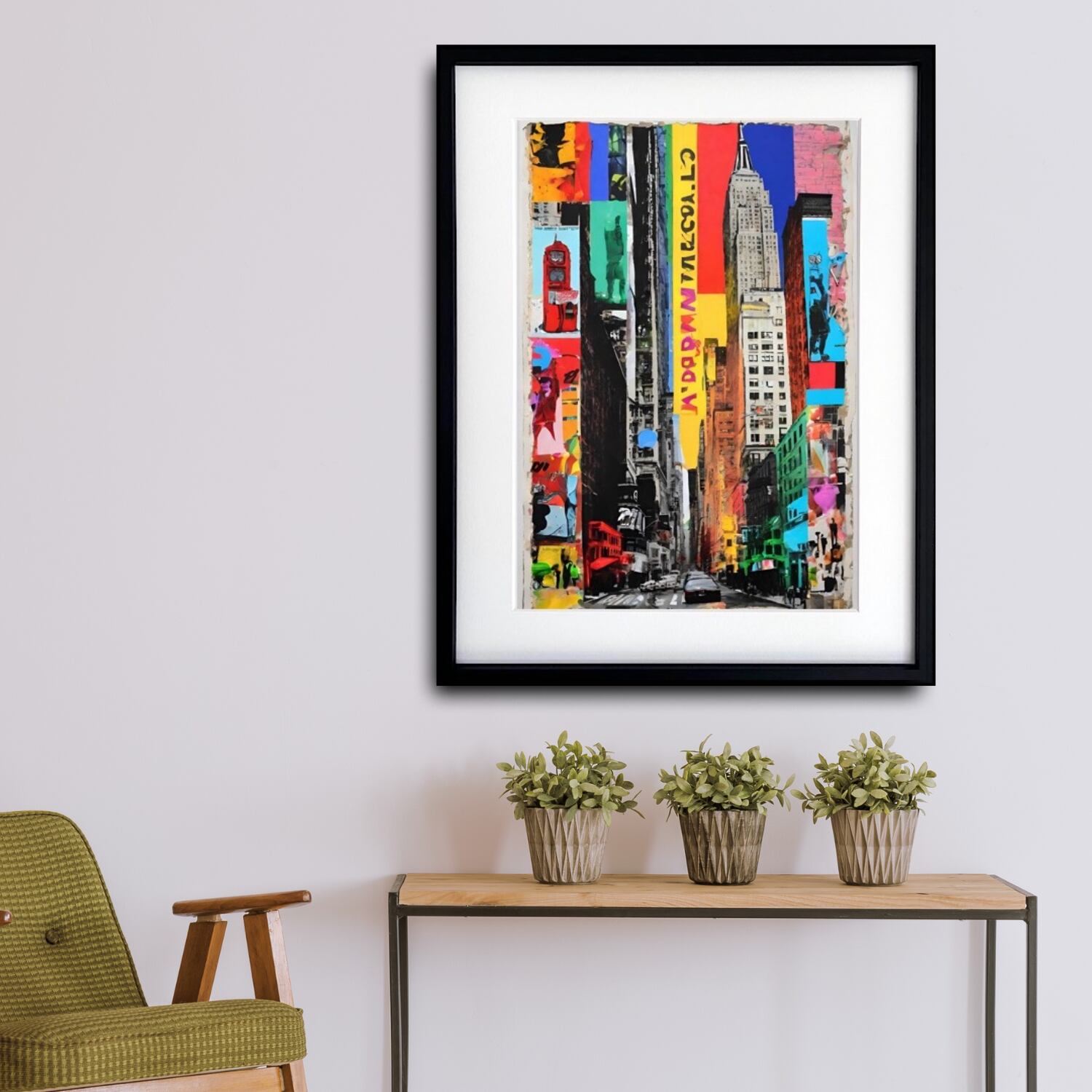 都市の喧騒と光のリズムをポップに切り取った、空間を一瞬で“都会的”に変えるアートです。