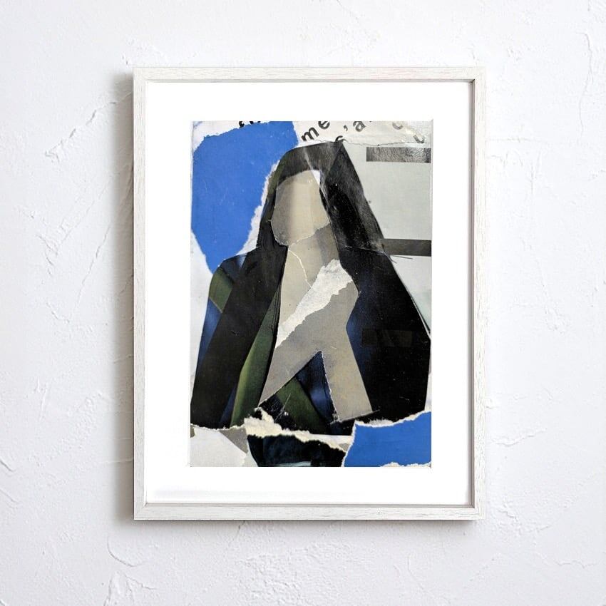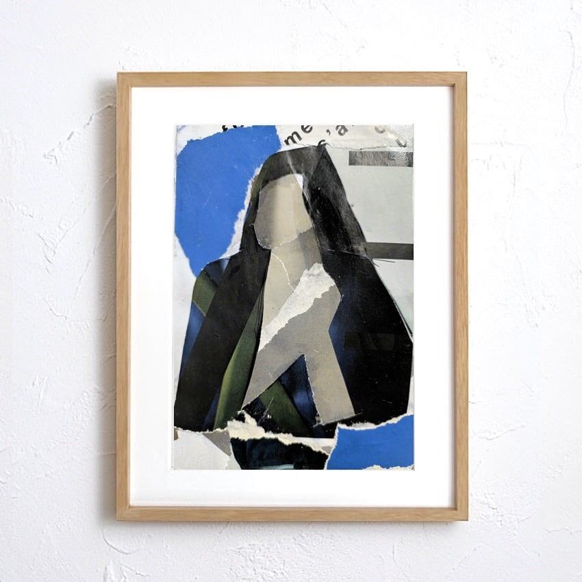 紙の質感と色彩が重なり、記憶のように浮かんでは消える表情を描き出すコラージュアートです。