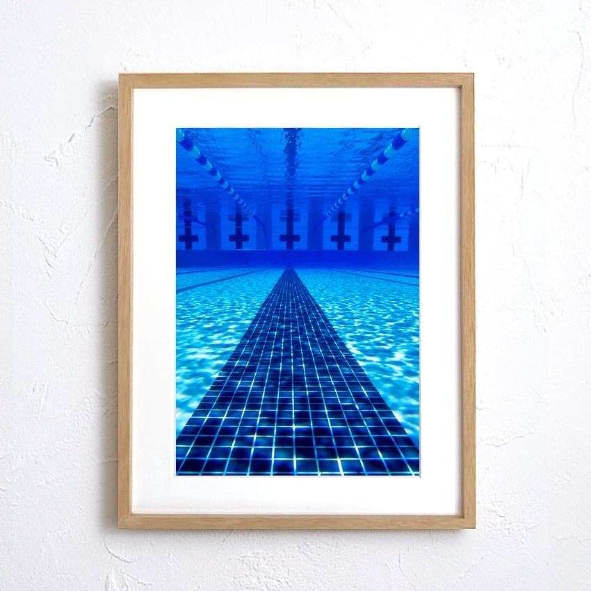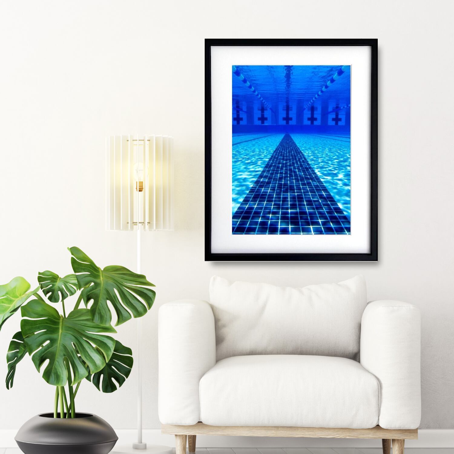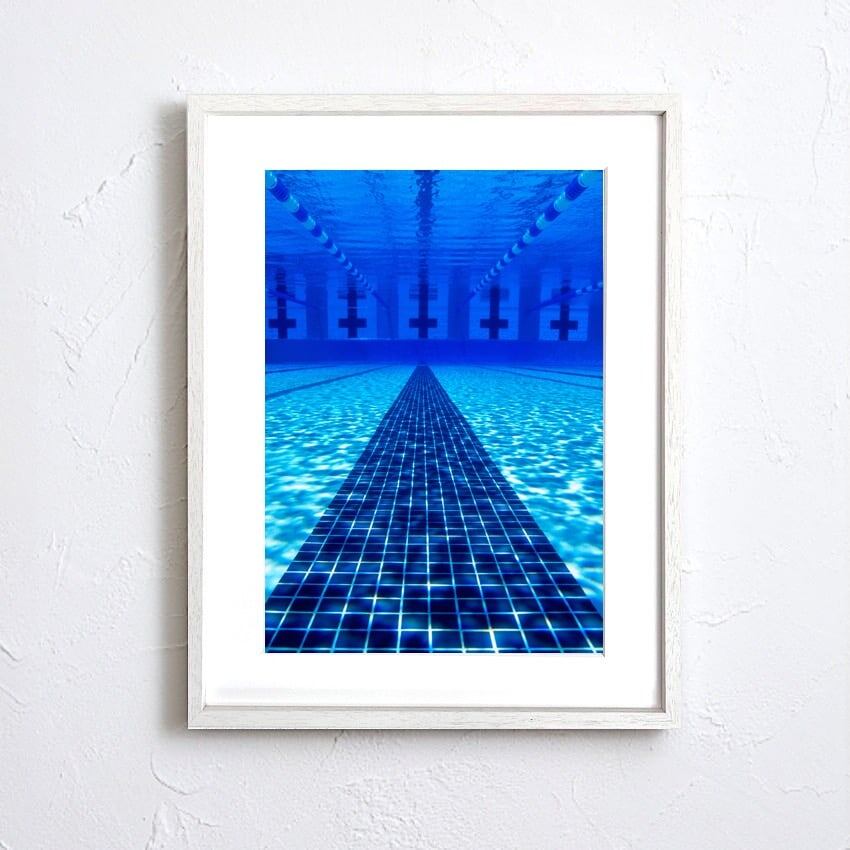 深いブルーの濃淡と水面のゆらぎを捉えた、プールの中から見たような視点のアートポスター。