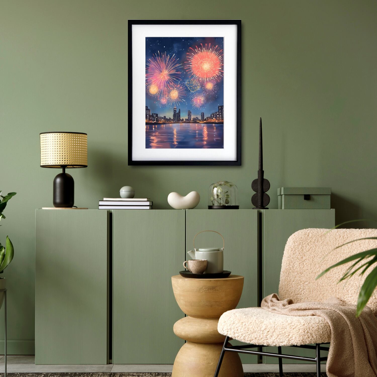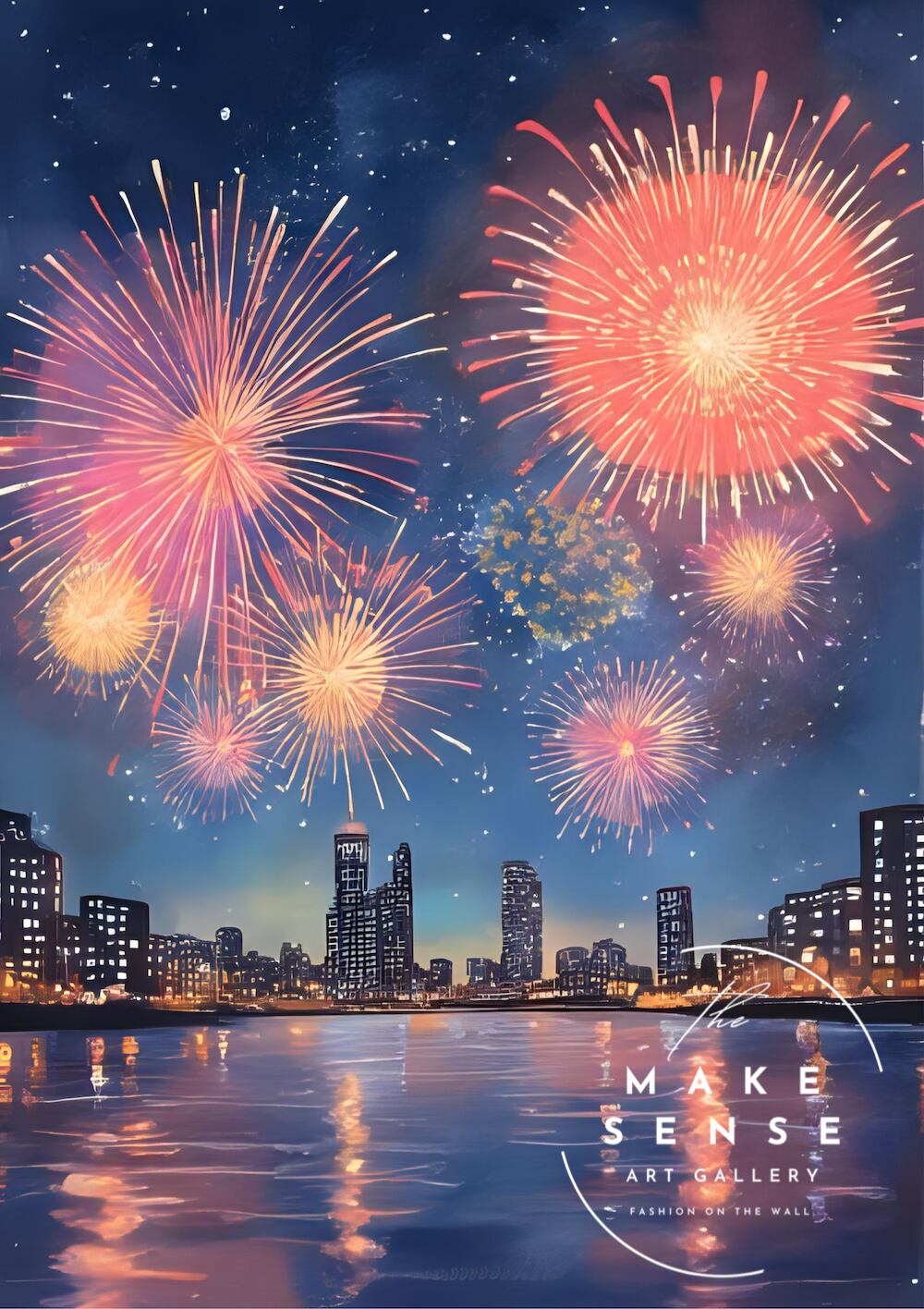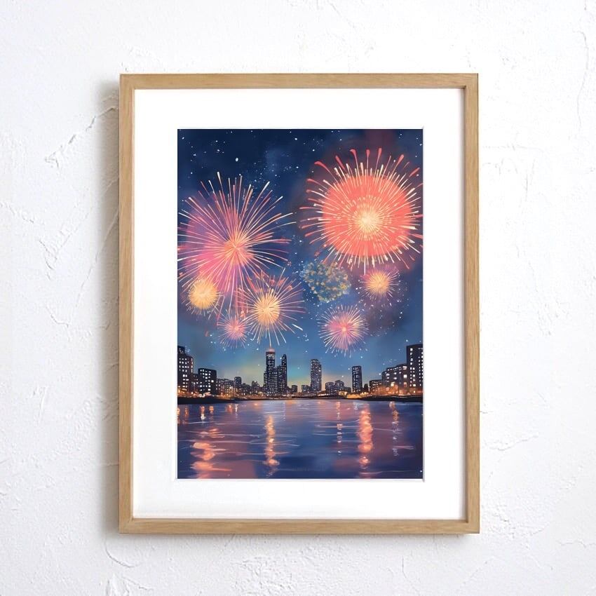 花火|都会夜景に咲く大輪の花火アートポスター|和モダン×幻想的デジタルアート|夏のインテリアに|A3ポスター