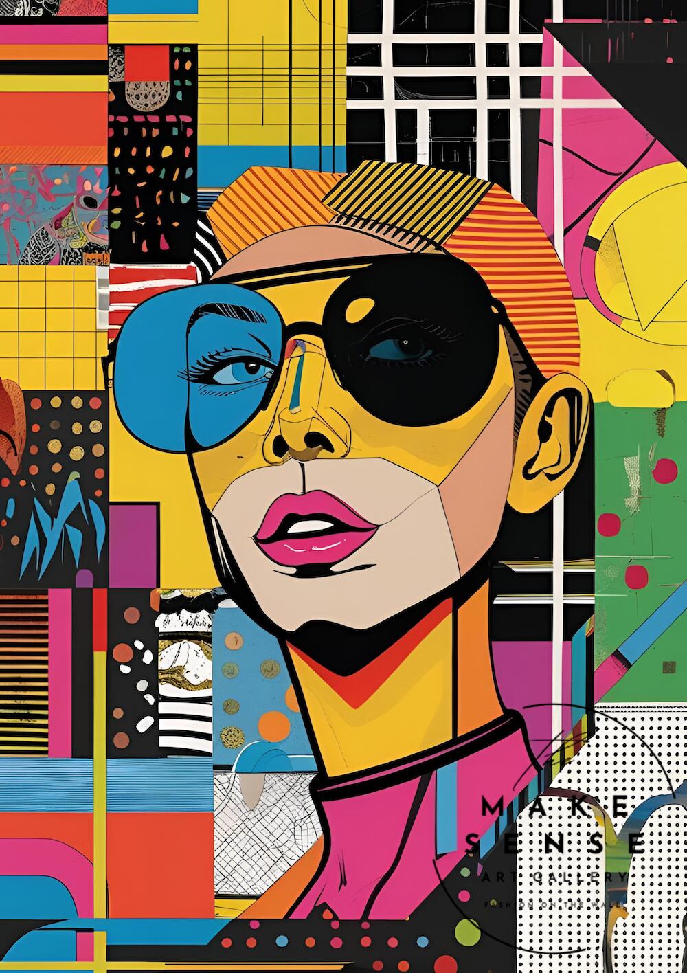 大胆な色彩と幾何学パターンで描いた女性ポートレート。