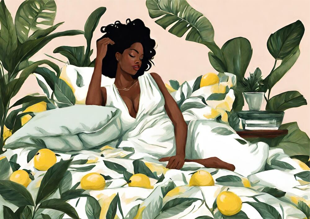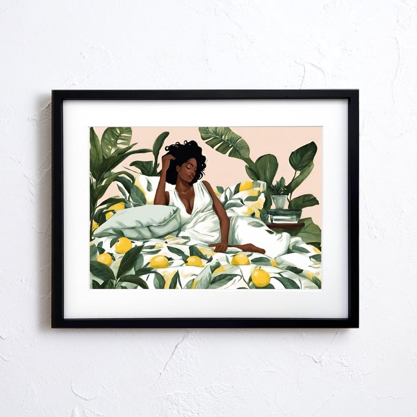 レモン柄のベッドで静かに眠る女性を描いた、爽やかなボタニカルアート。