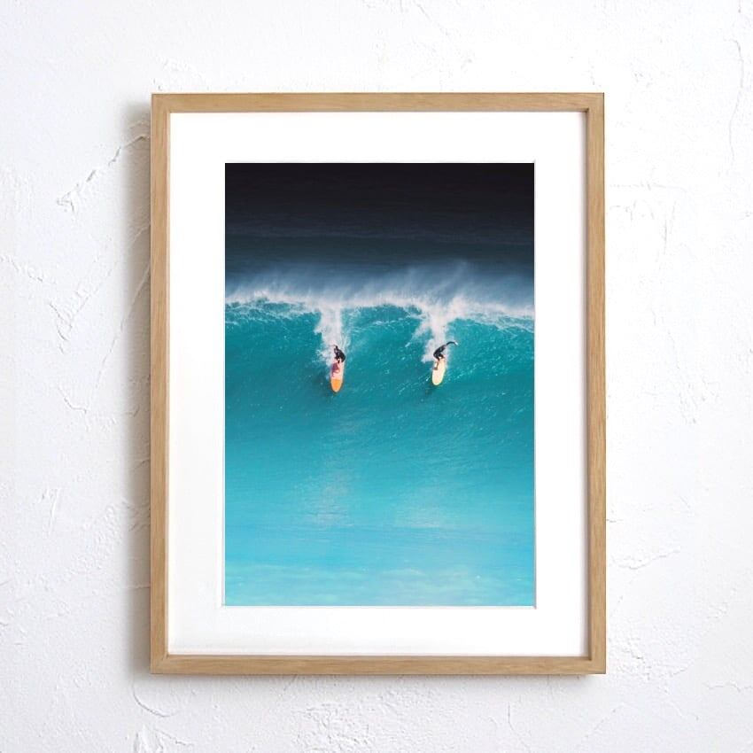 巨大な波を滑り降りるサーファー二人を捉えた一瞬の迫力を、洗練されたトーンで仕上げたフォトアート。