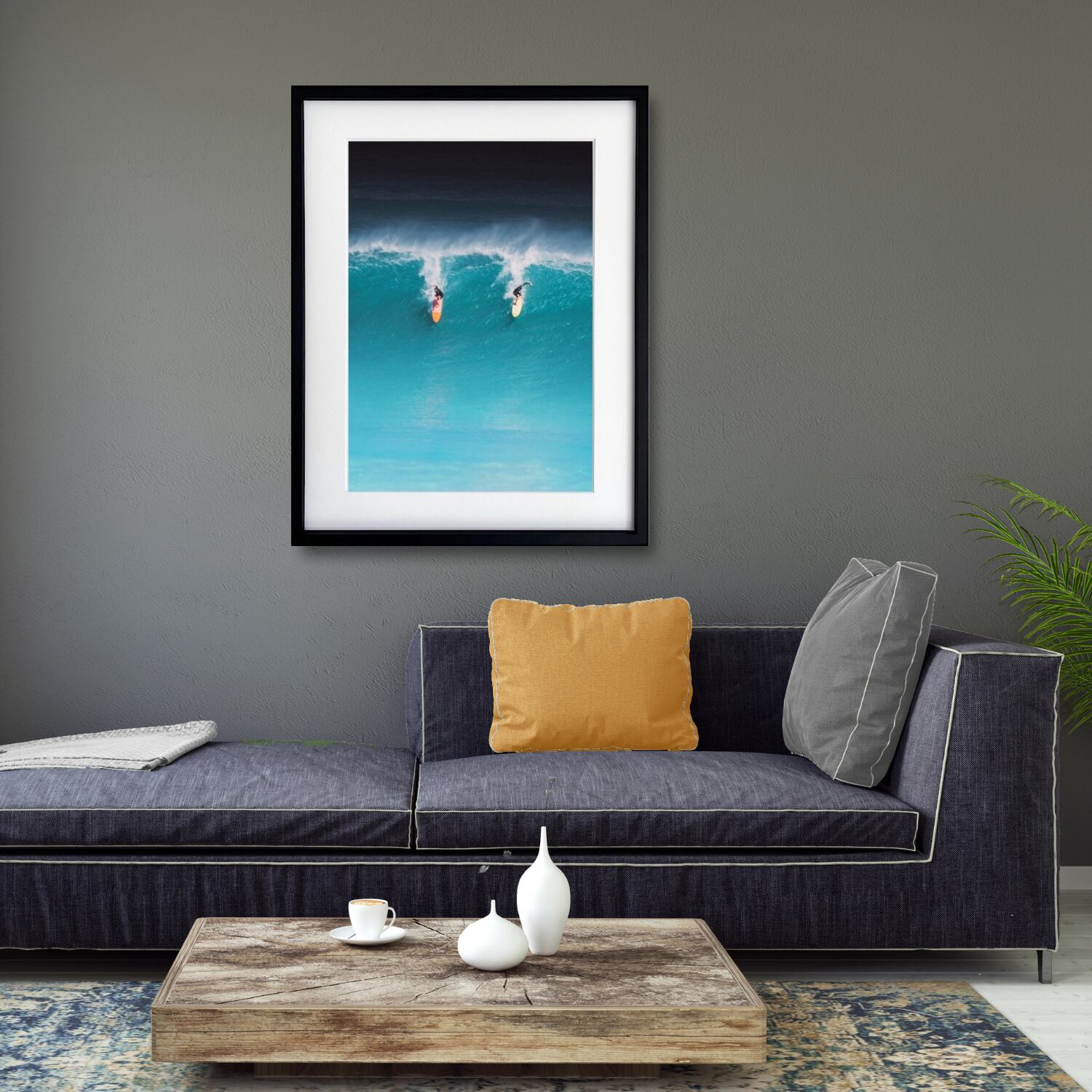 深いコバルトブルーの海と白いスプレーが美しく、空間に“海のエネルギーとスリル”をそっと添えます。