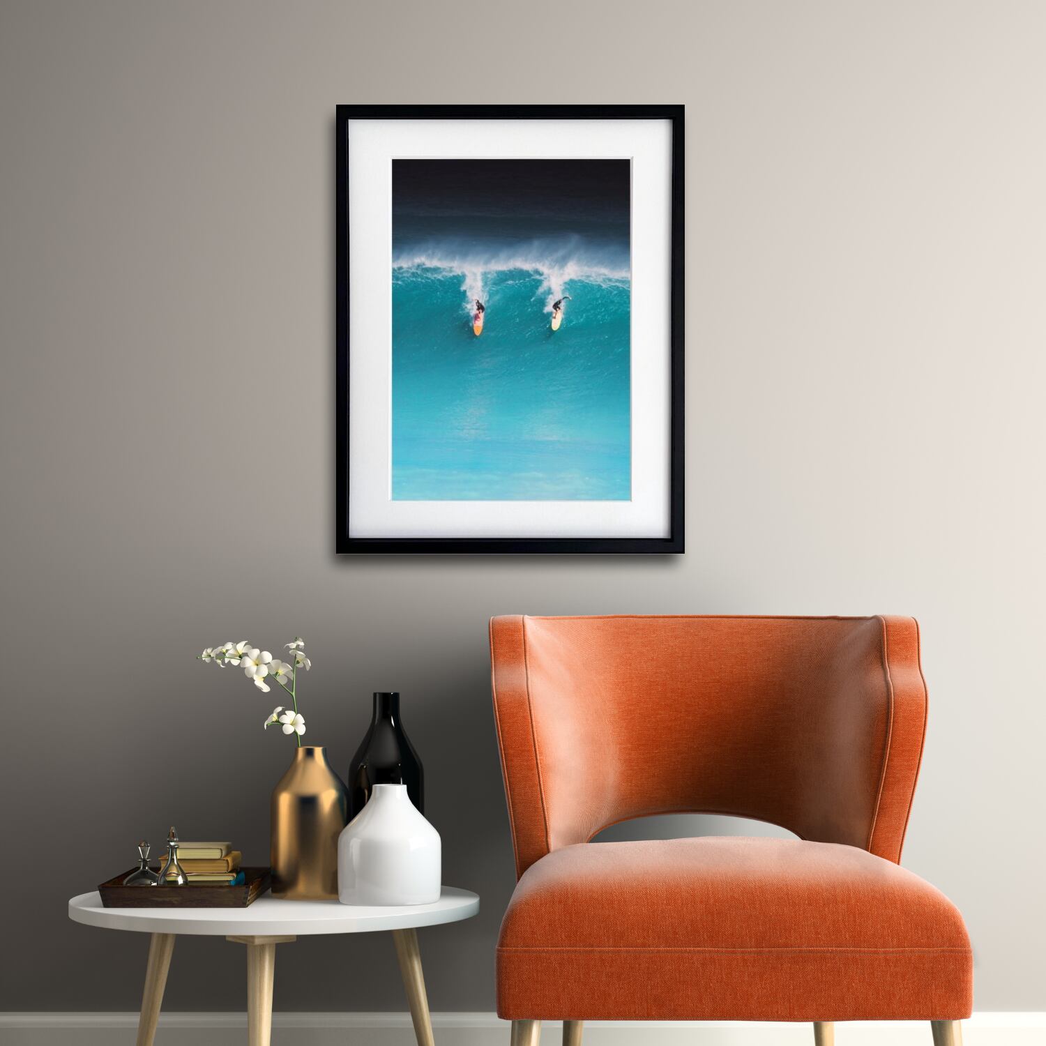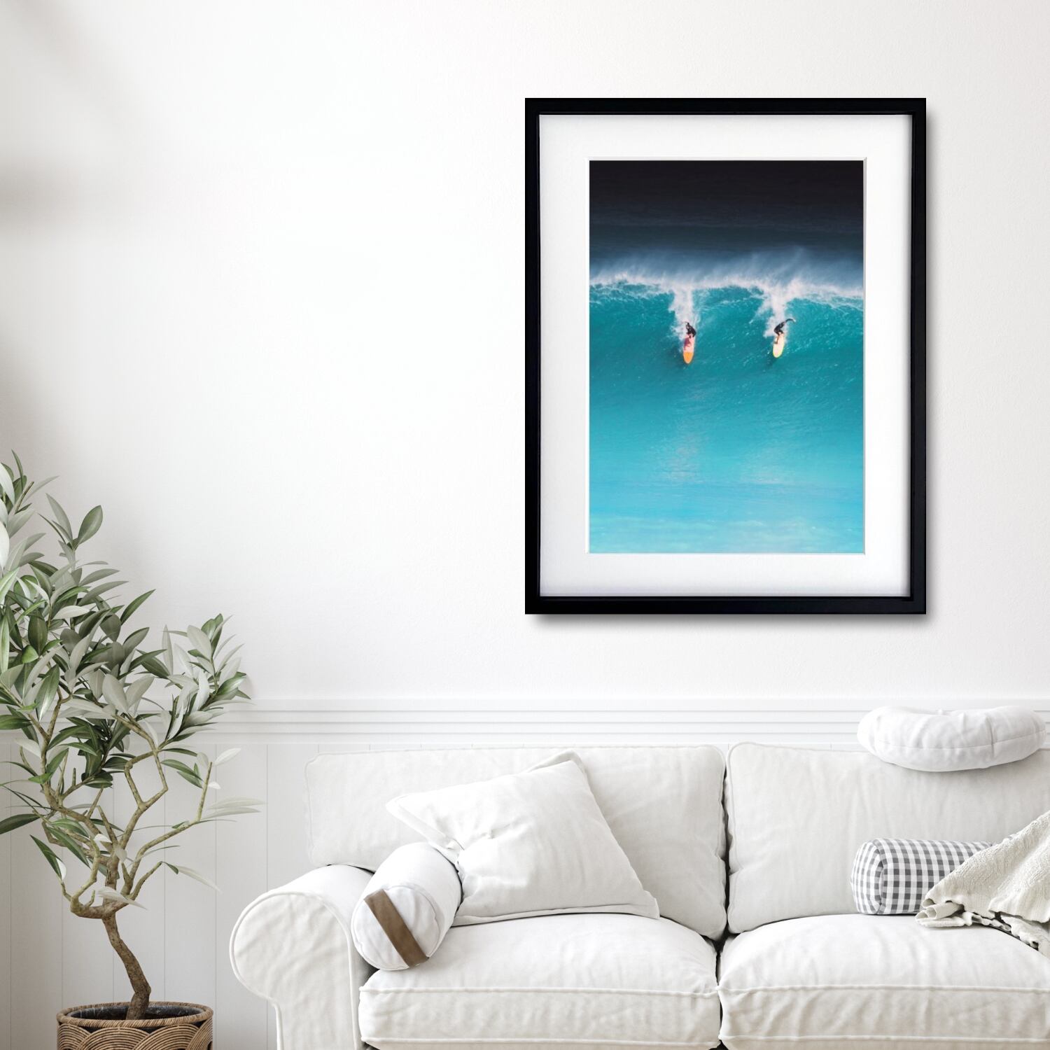 巨大な波を滑り降りるサーファー二人を捉えた一瞬の迫力を、洗練されたトーンで仕上げたフォトアート。