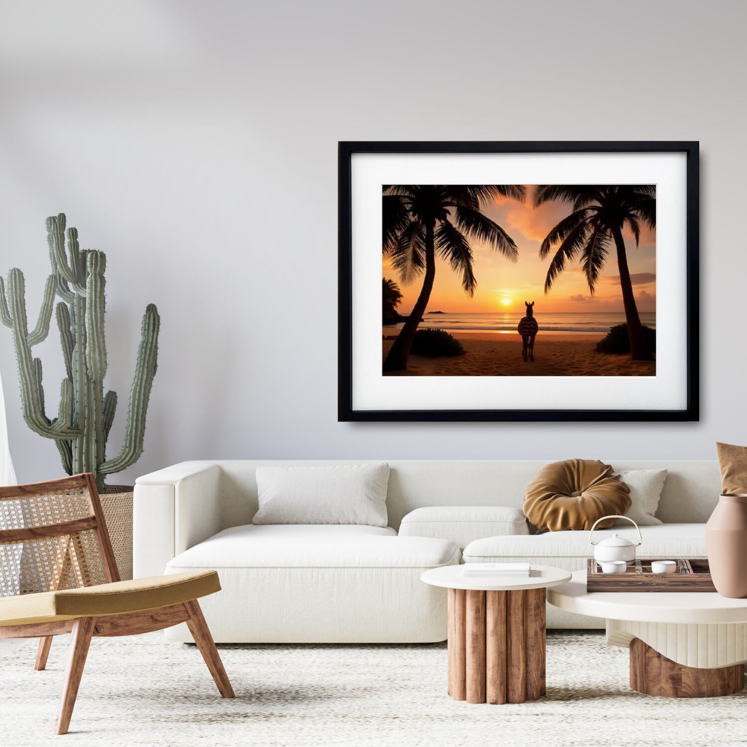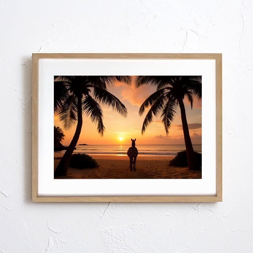 故郷を想うシマウマ|夕焼けを見つめる癒しのシマウマアートポスター|南国ビーチの物語を空間に添える一枚|A2ポスター