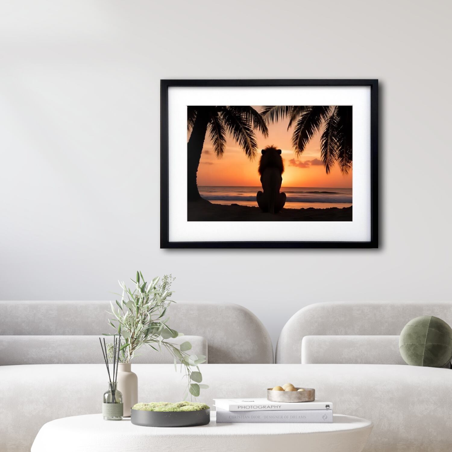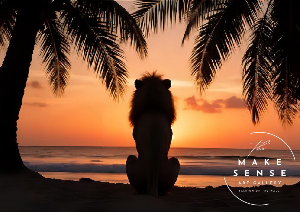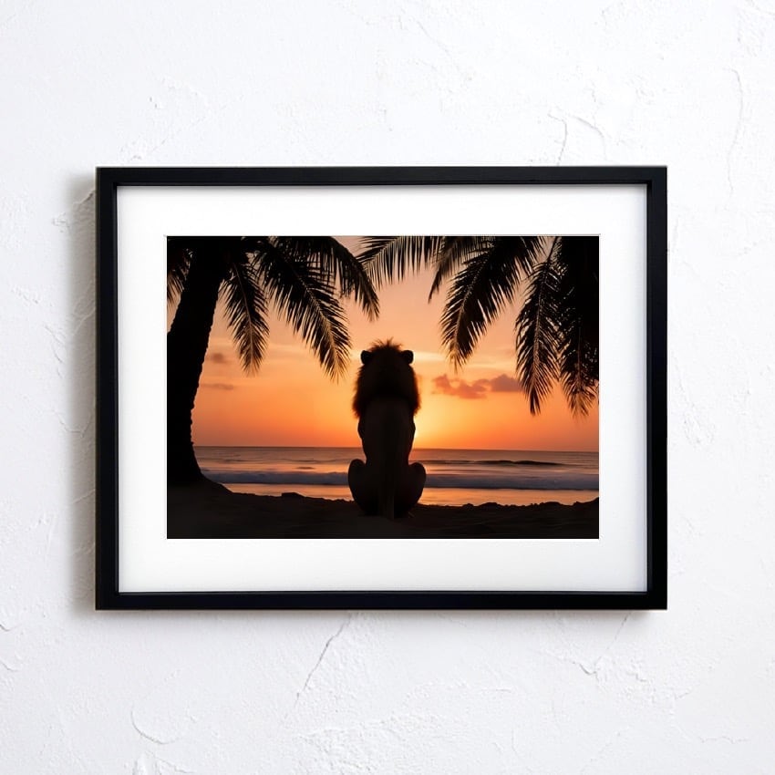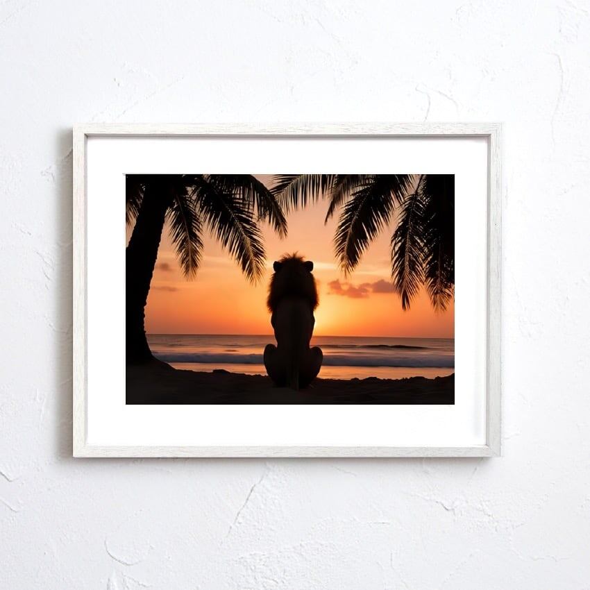 故郷を想うライオン|夕焼けを見つめる癒しのライオンアートポスター|南国ビーチの静かな物語を空間に添える|A3ポスター