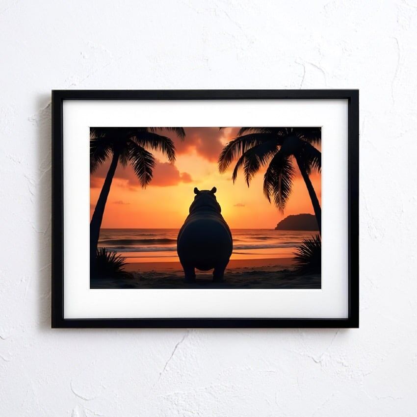 故郷を想うカバ|夕焼けを見つめる癒しのカバアートポスター|南国ビーチの優しい物語性を空間に|A4ポスター