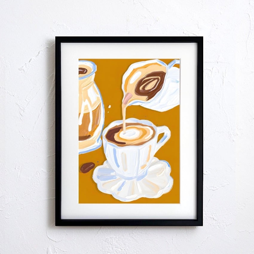 コーヒーがカップに注がれる瞬間を、やわらかいドローイング調で描いた一枚。