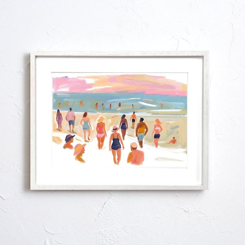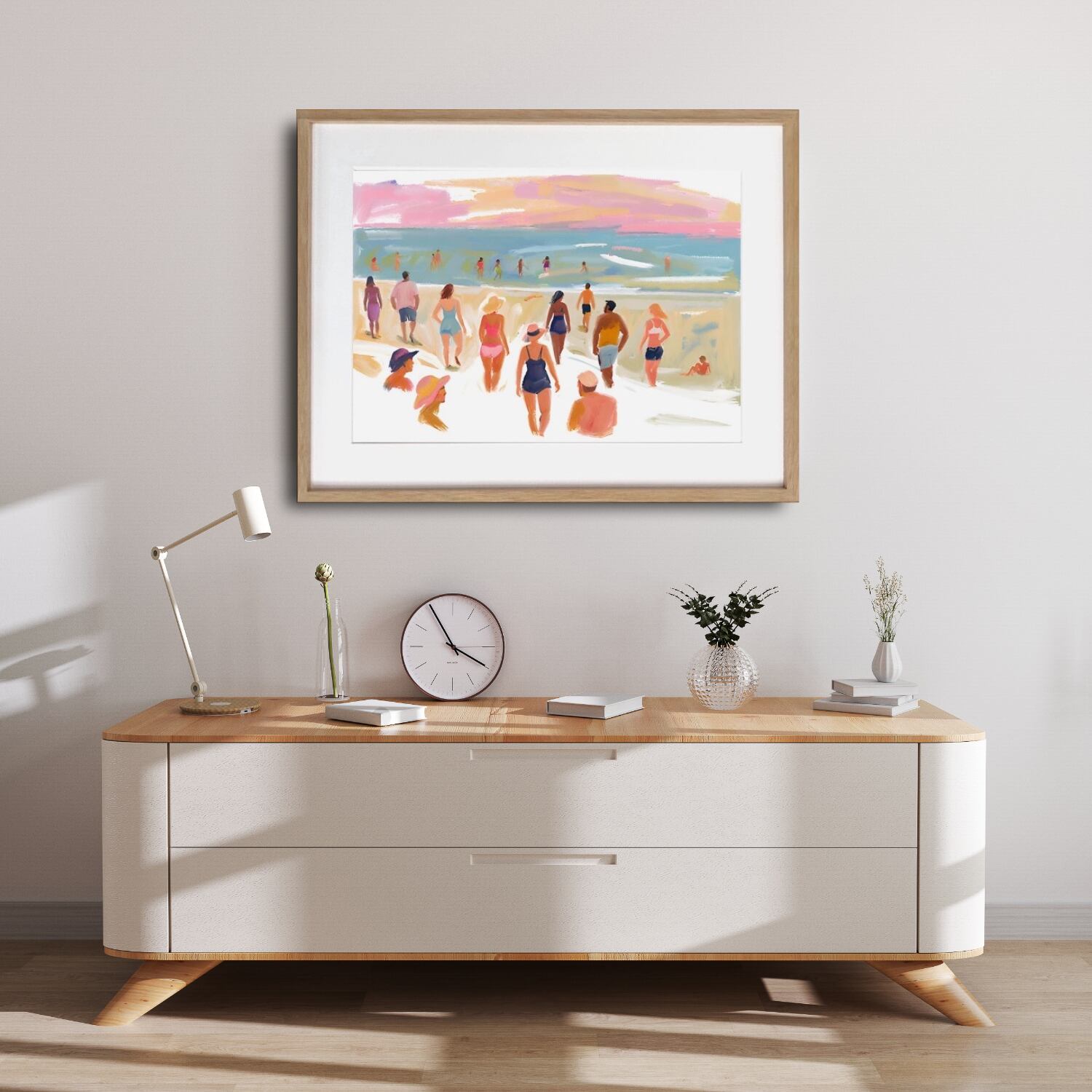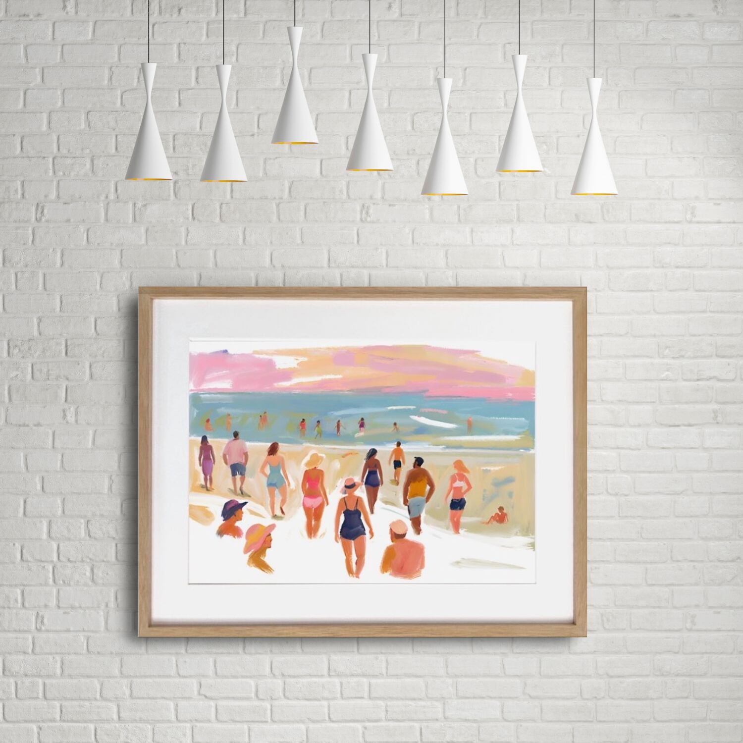 ピンク色に染まる夕暮れのビーチを、柔らかなドローイング調で描いた癒しのアートポスター。