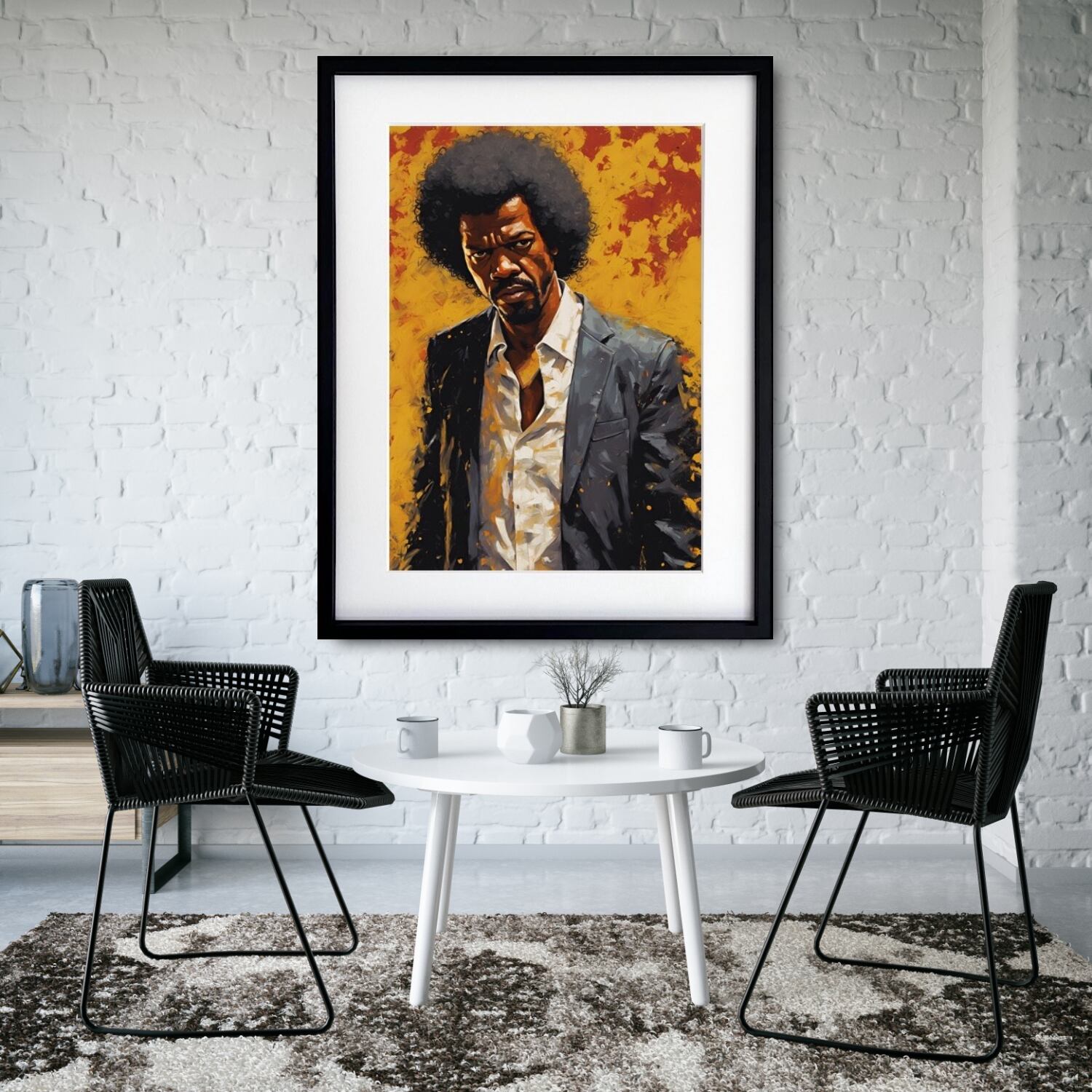 名作「パルプフィクション」のジュールスを、鮮やかな色彩でクールに描いた映画アートポスター。