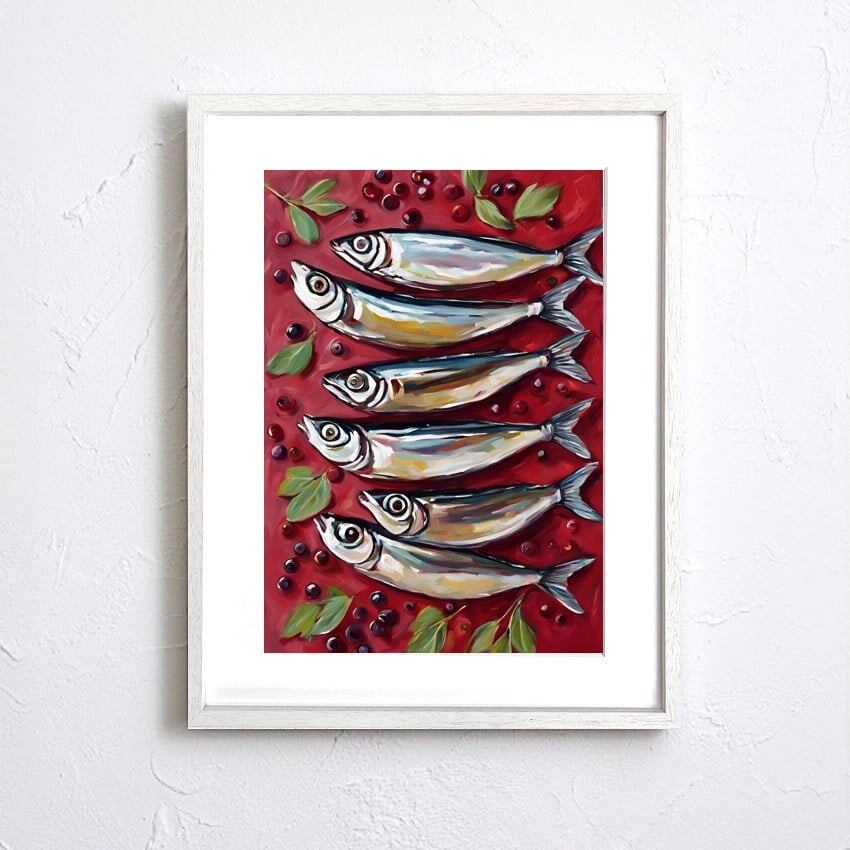 sardines|可愛いイワシを並べたユニークなコンテンポラリーアートポスター|キッチンやダイニングを彩る食アートインテリア|北欧風モダンにも相性抜群A4ポスター