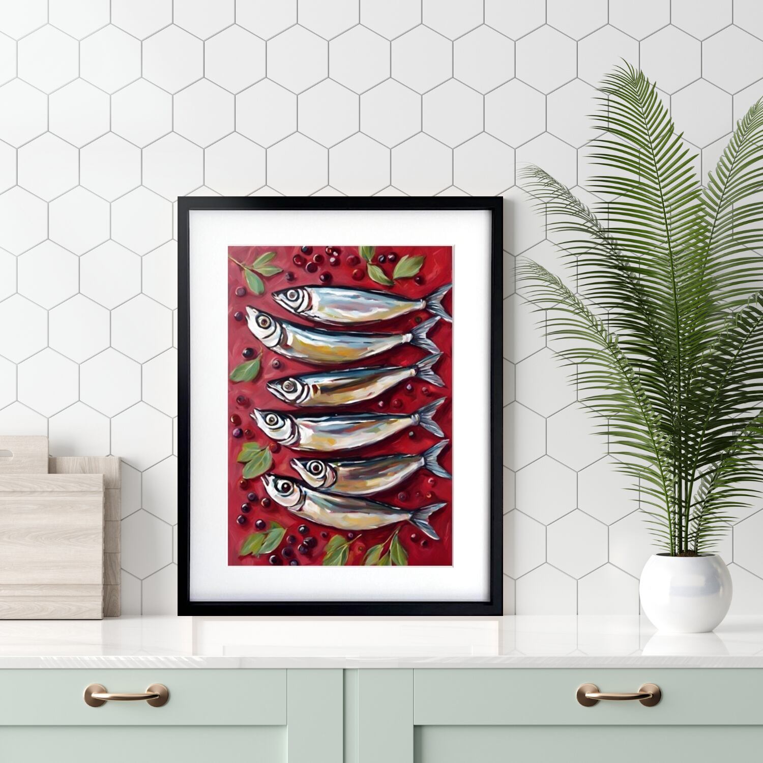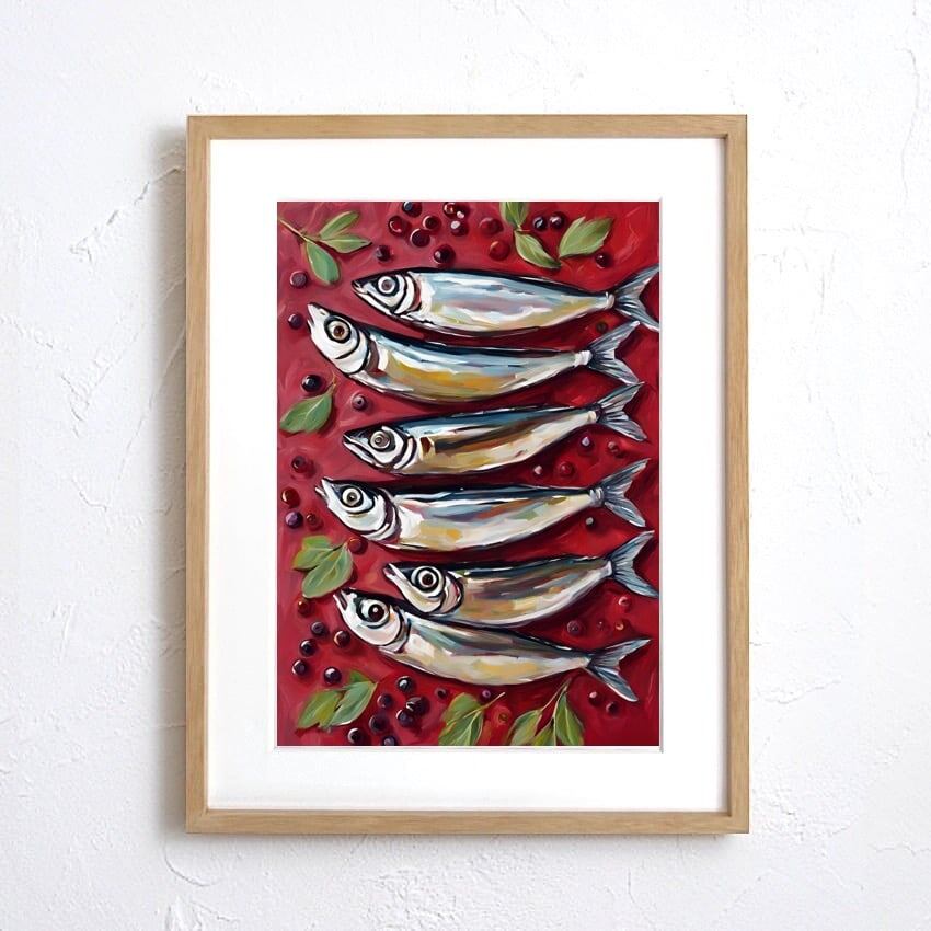 sardines|可愛いイワシを並べたユニークなコンテンポラリーアートポスター|キッチンやダイニングを彩る食アートインテリア|北欧風モダンにも相性抜群A3ポスター