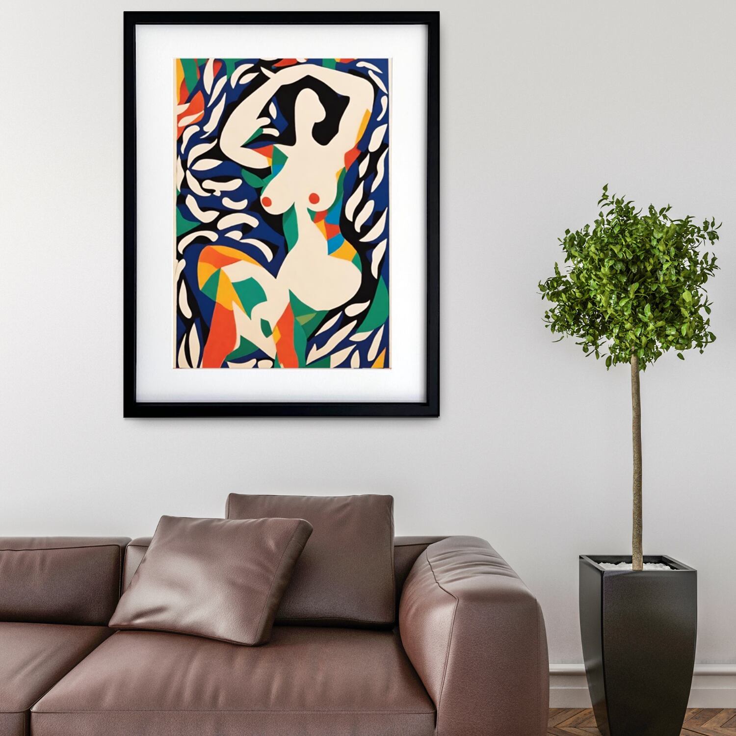 切り絵のようなラインで描かれた女性と、色鮮やかなボタニカルが調和するモダンアート。