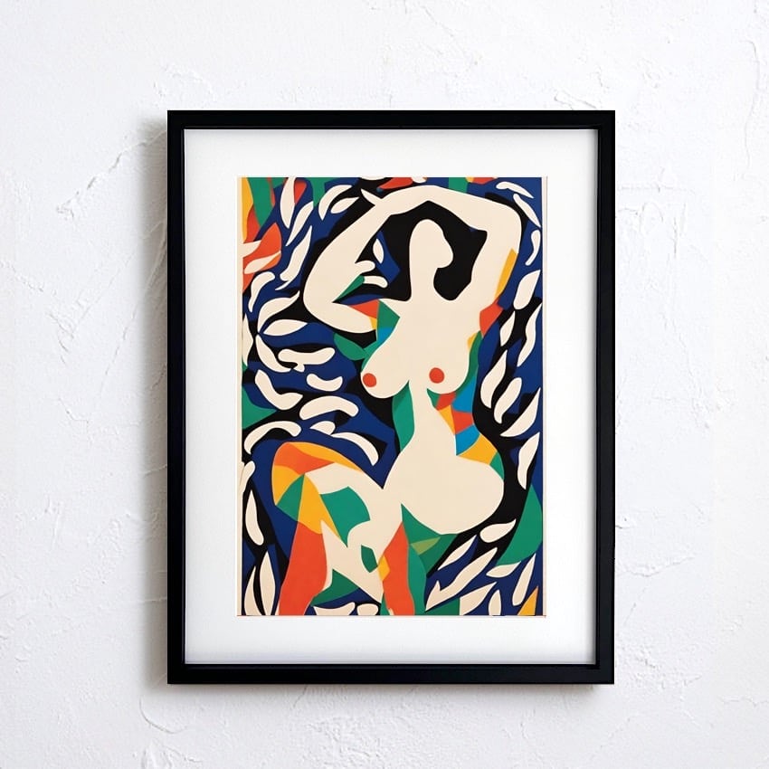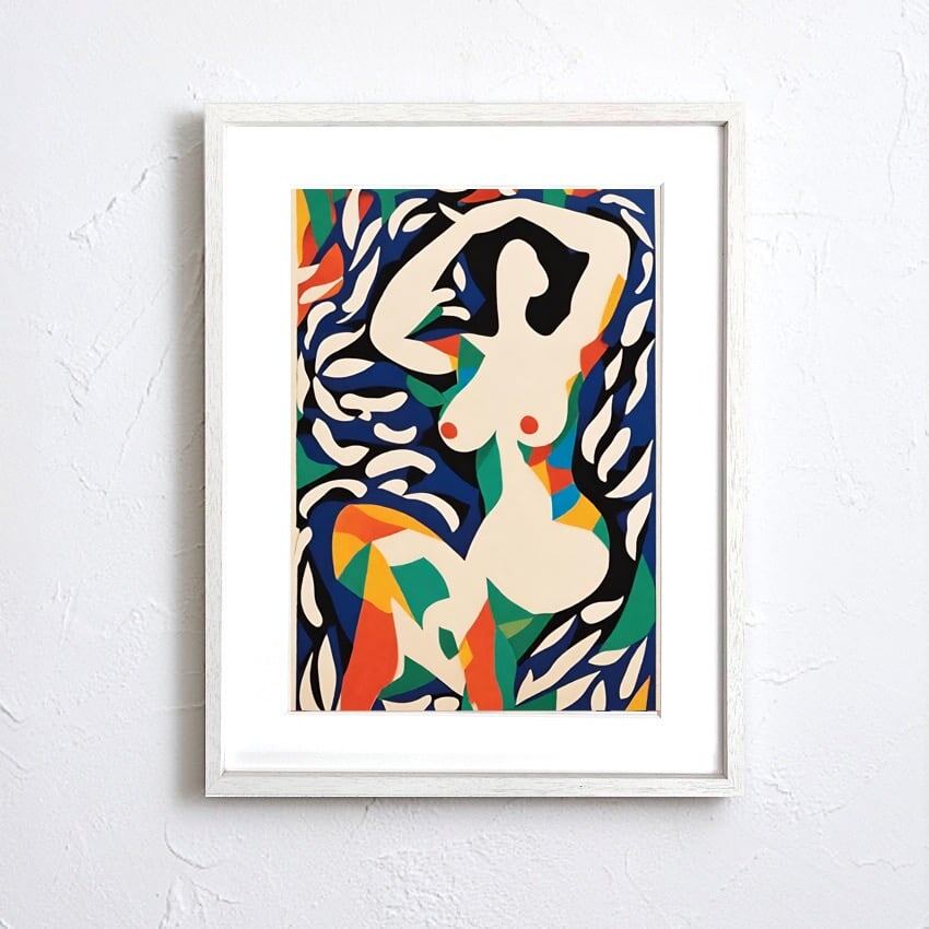 切り絵のようなラインで描かれた女性と、色鮮やかなボタニカルが調和するモダンアート。