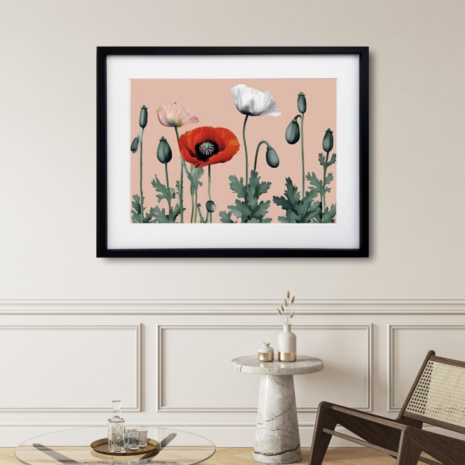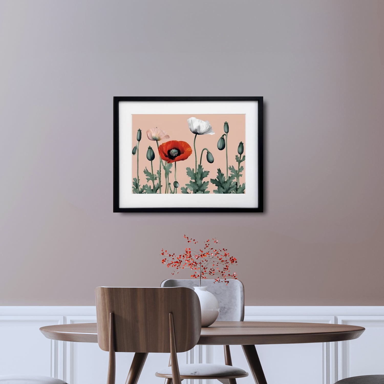 Crescendo|軽やかに咲くポピーを描いたミニマルボタニカルアートポスター|余白が美しい北欧モダンデザイン|リビング寝室玄関に映える上品な花のインテリアアート|大人の空間におすすめA4ポスター