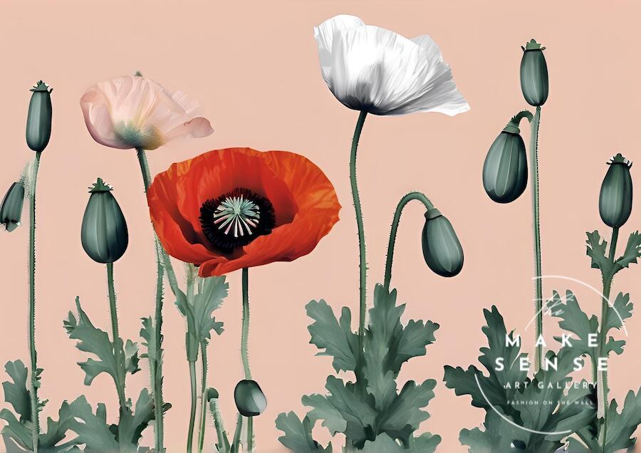 Crescendo|軽やかに咲くポピーを描いたミニマルボタニカルアートポスター|余白が美しい北欧モダンデザイン|リビング寝室玄関に映える上品な花のインテリアアート|大人の空間におすすめA2ポスター