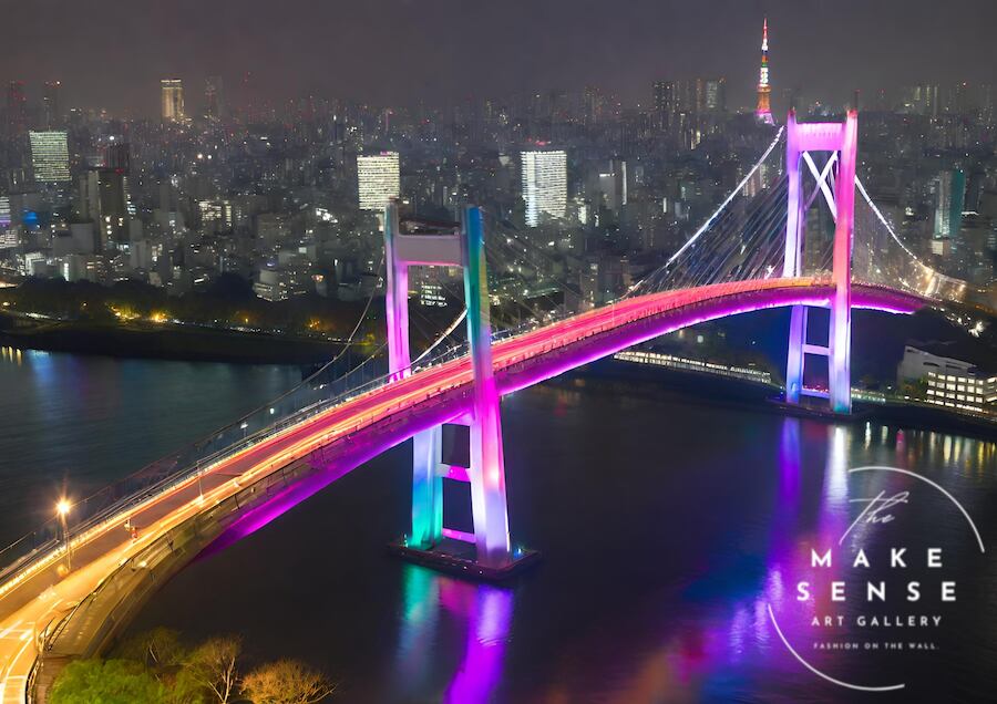 レインボーブリッジ越しに眺める東京タワーを、ドローイング調でスタイリッシュに描いた夜景アート。