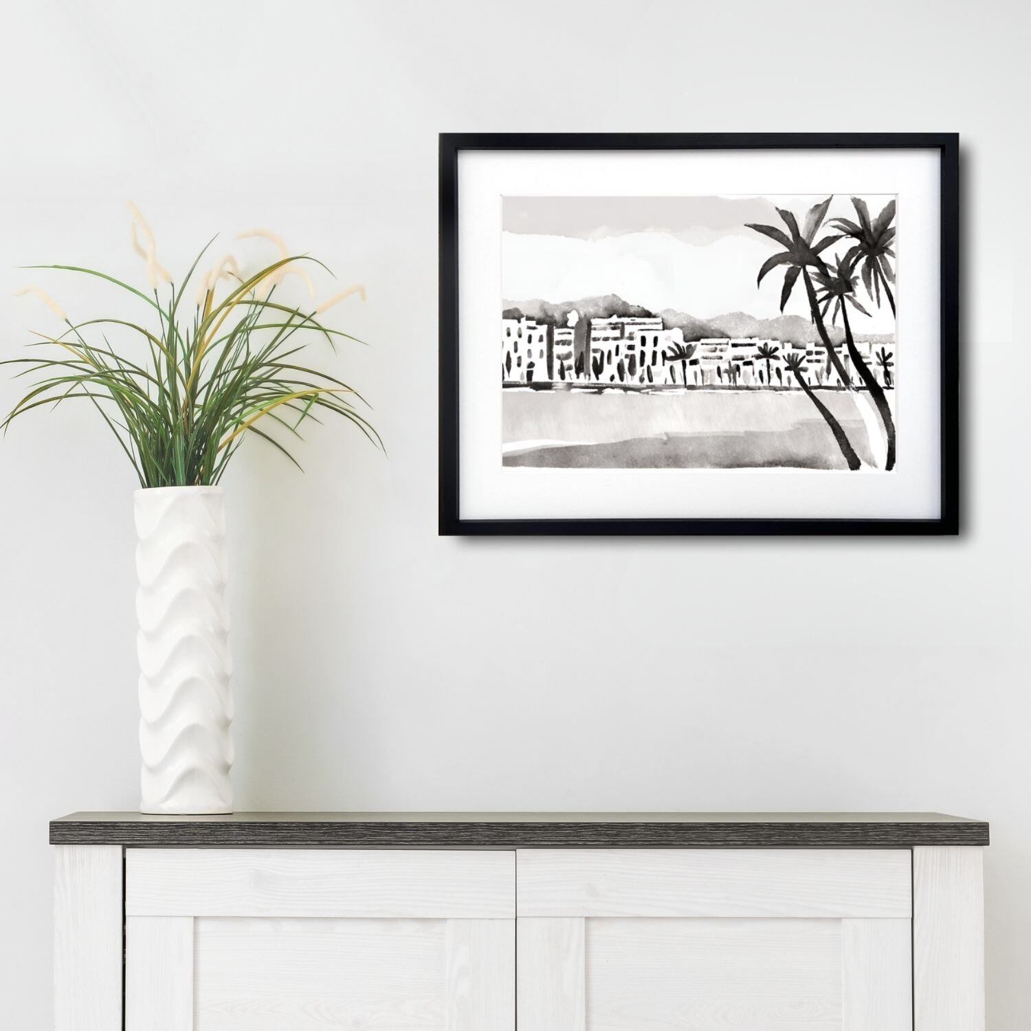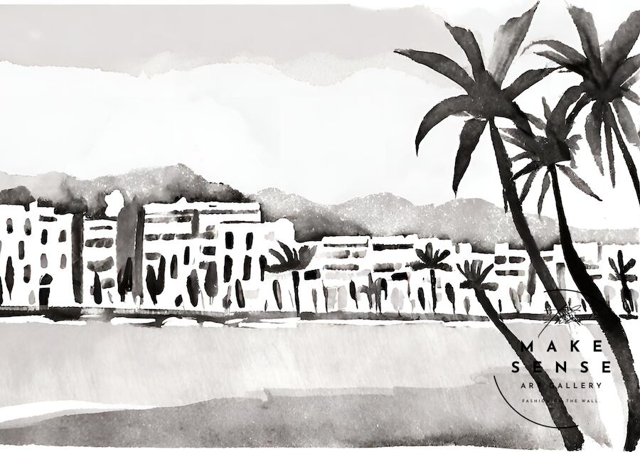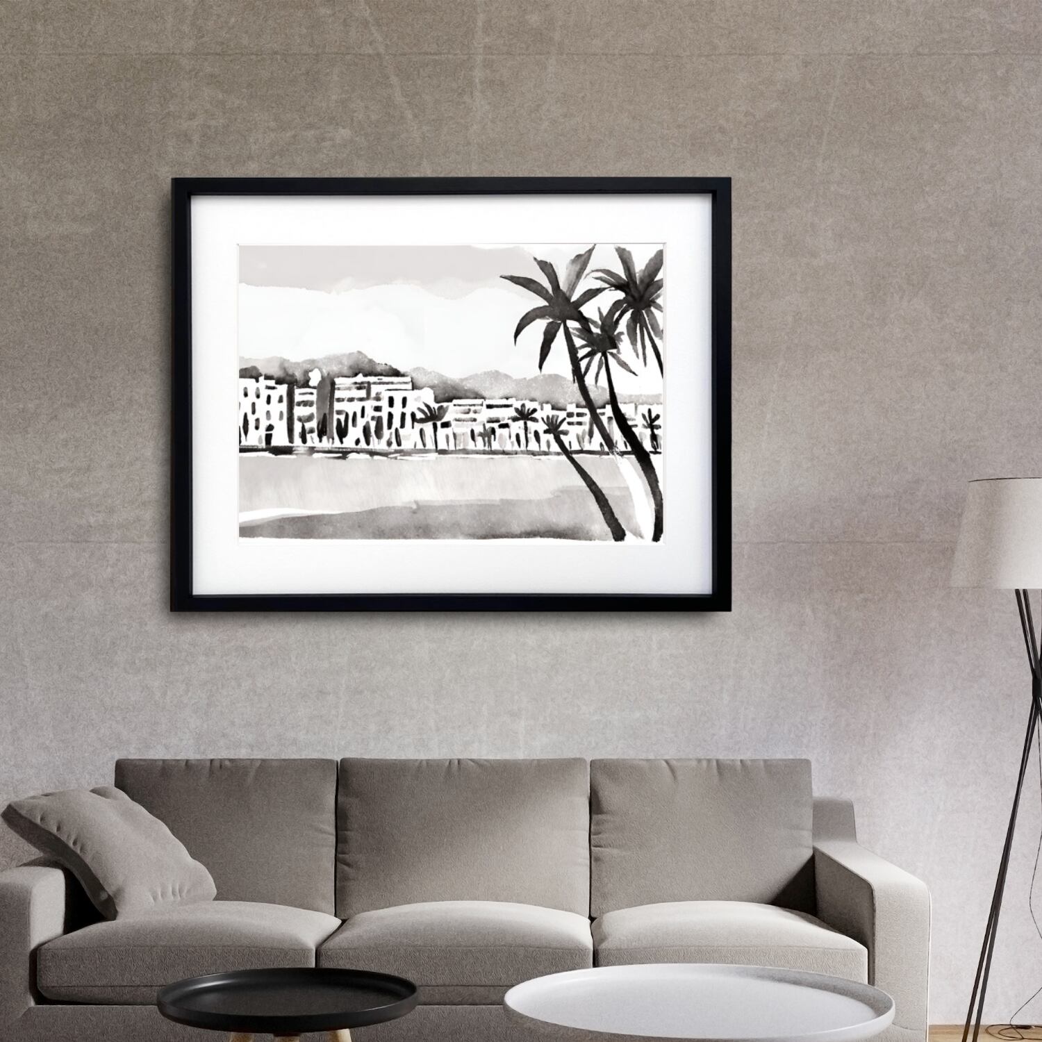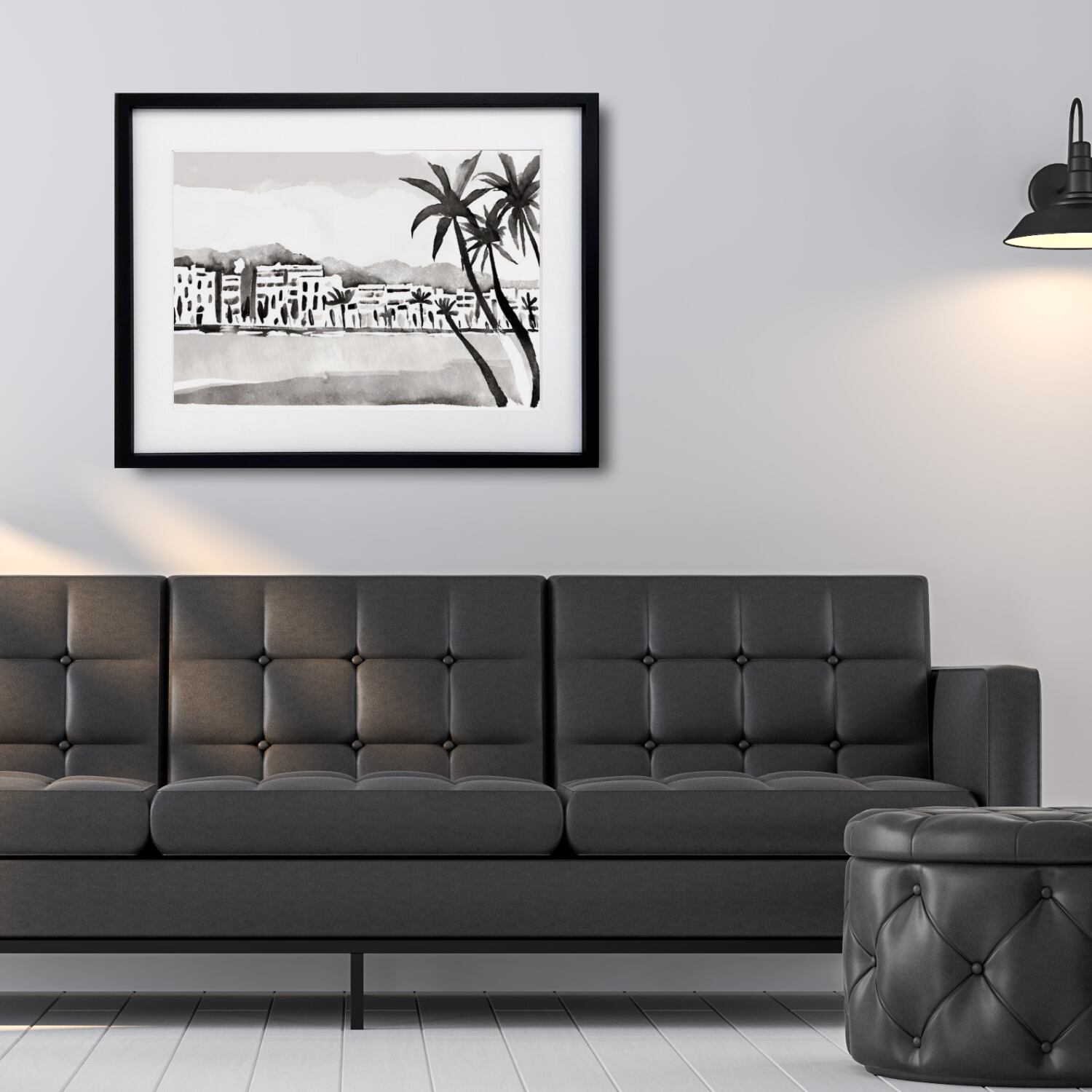 海へと続く静かな道をモノクロで表現した、大人のための上質アートポスター。