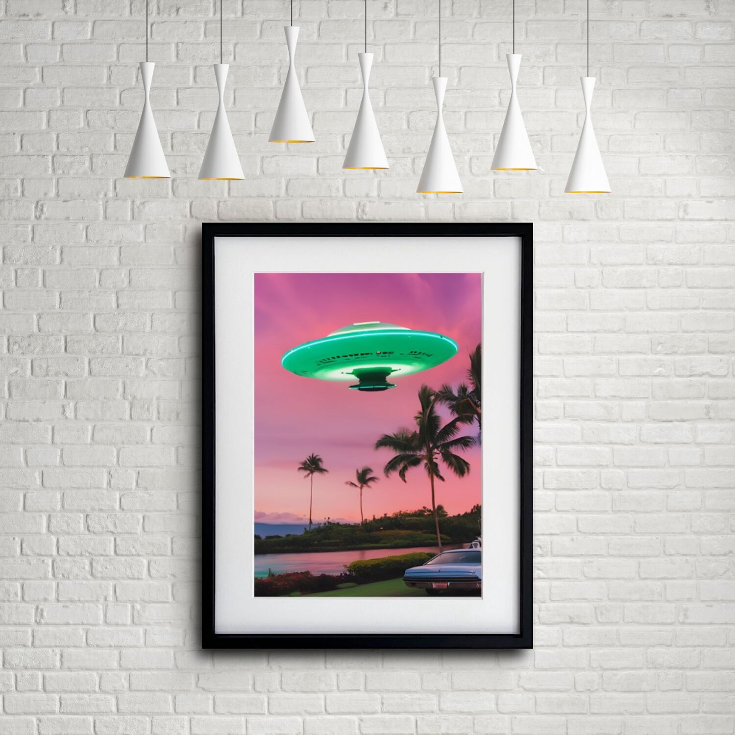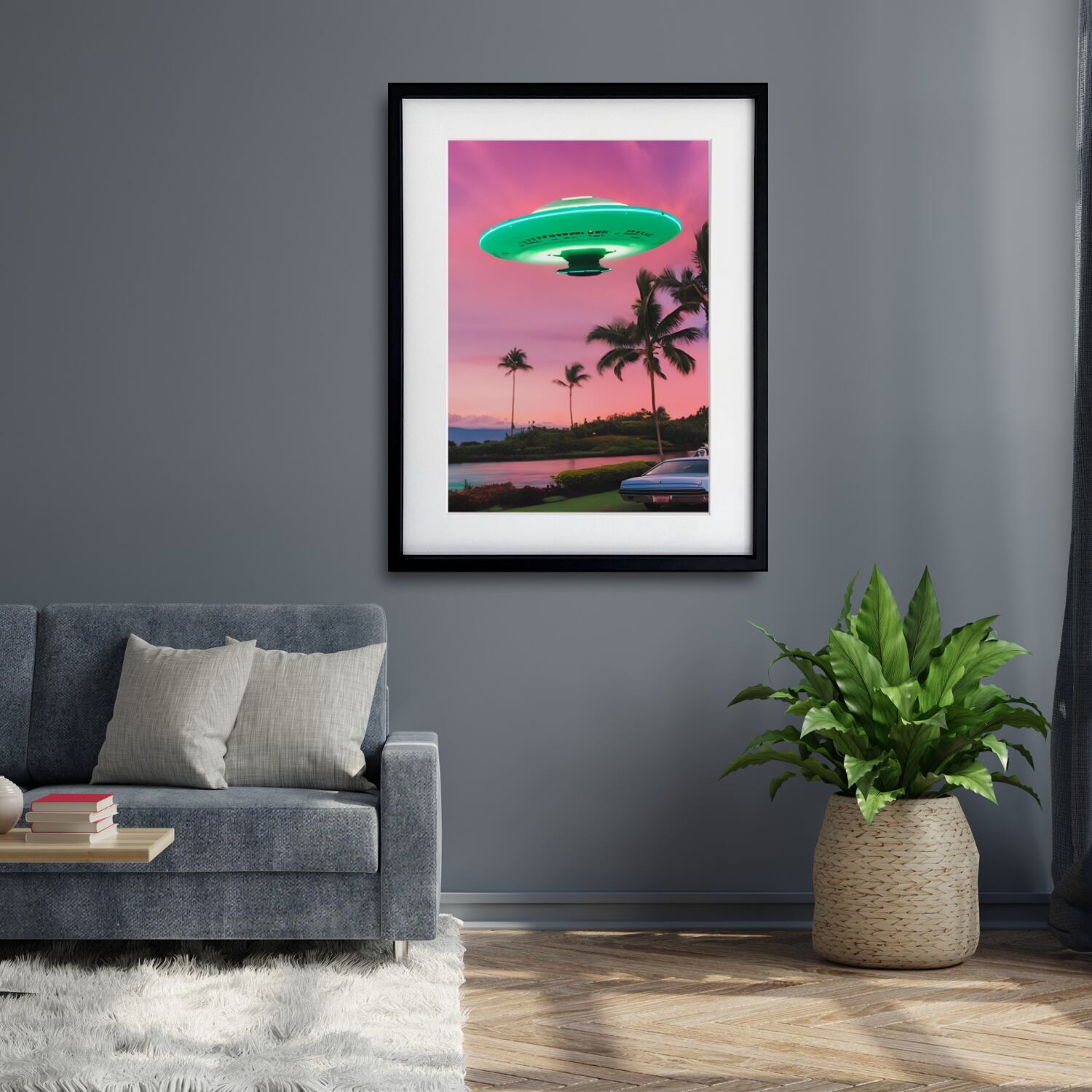 旅をするUFOをユニークかつ神秘的に描いたアートポスター。