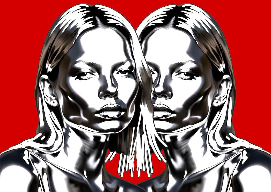 メタリックな質感で女性像を描いた、存在感あふれる抽象アート。