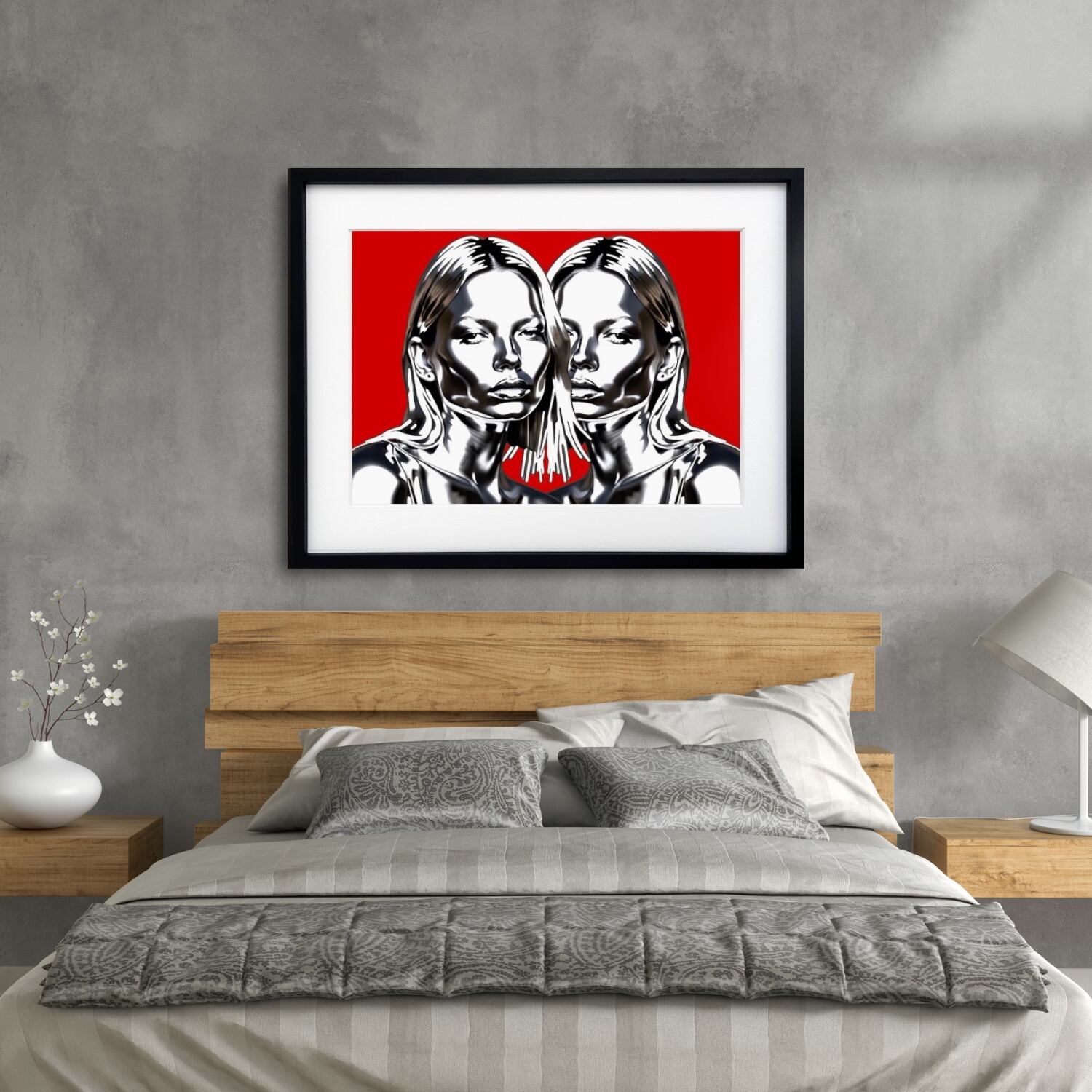 メタリックな質感で女性像を描いた、存在感あふれる抽象アート。
