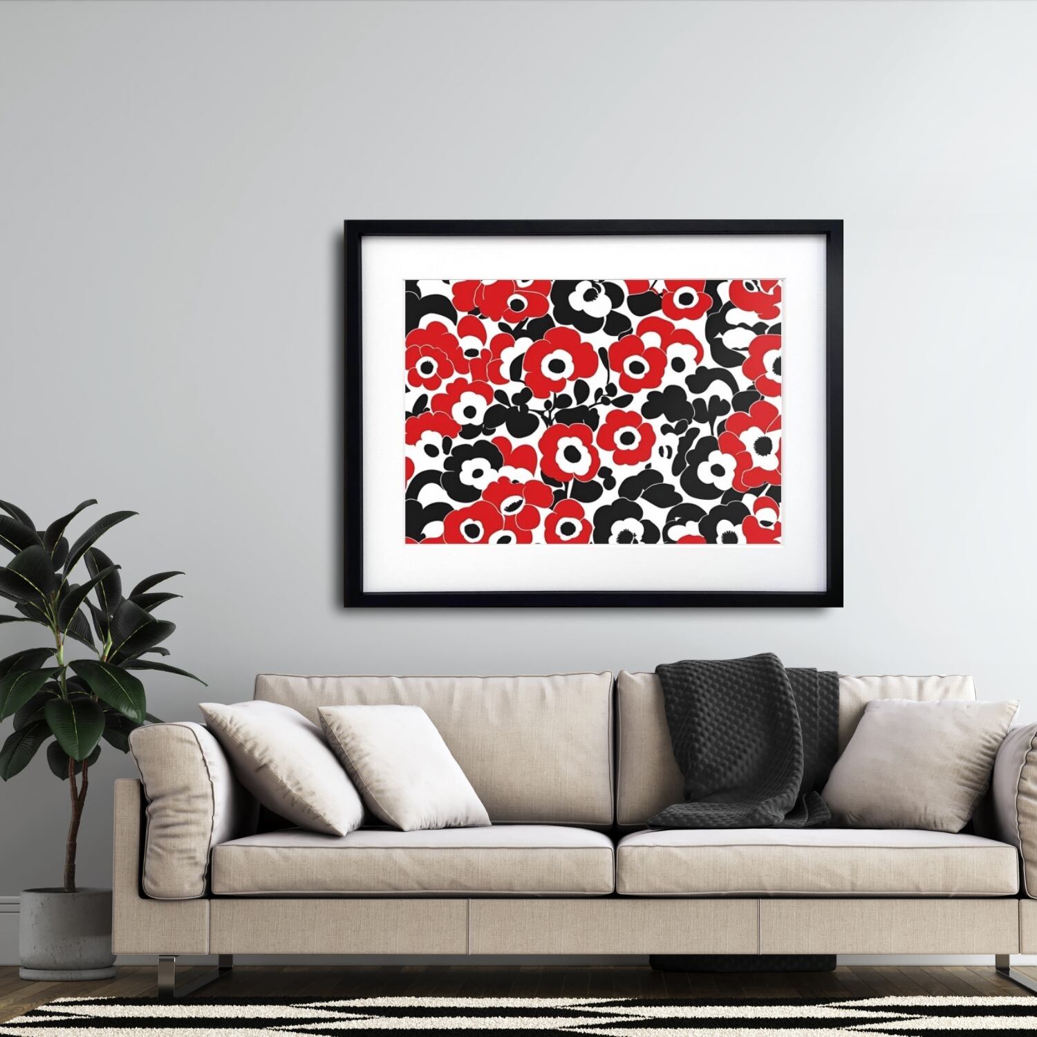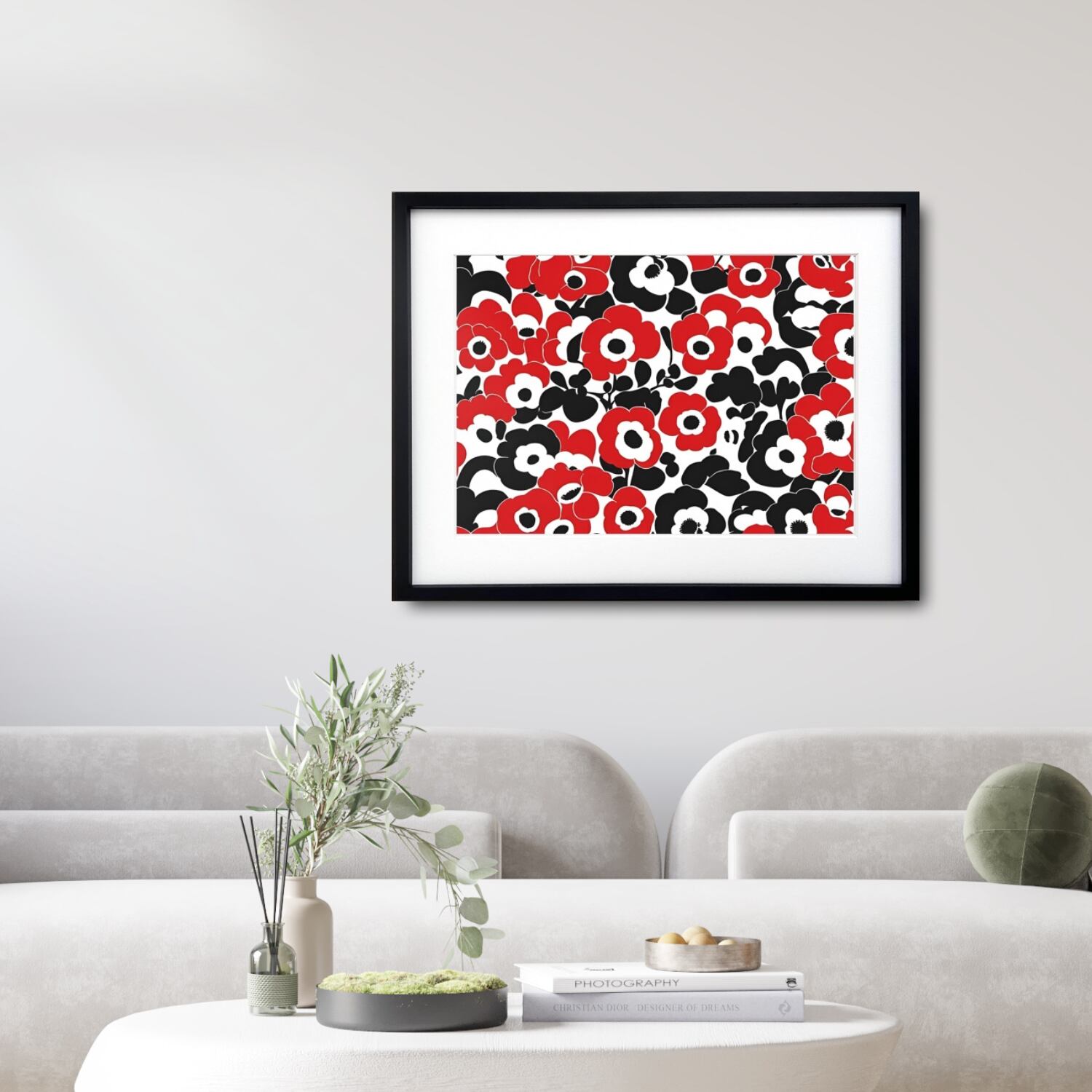 赤と黒のマリメッコ 調和の取れた美しいポピーをアート表現。北欧、ボタニカル、ミニマルスタイルなインテリアに相性良く、センスある部屋に変わります。