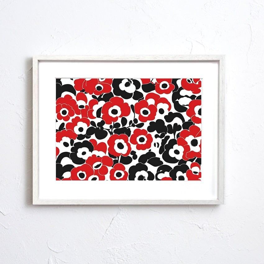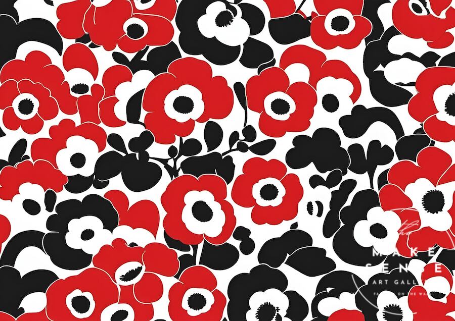 赤と黒のマリメッコ 調和の取れた美しいポピーをアート表現。北欧、ボタニカル、ミニマルスタイルなインテリアに相性良く、センスある部屋に変わります。